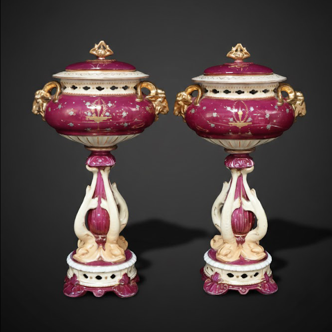 塞夫勒(Sèvres)风格,炉身以玫红釉为主,配以描金与透雕工艺,华贵典雅。