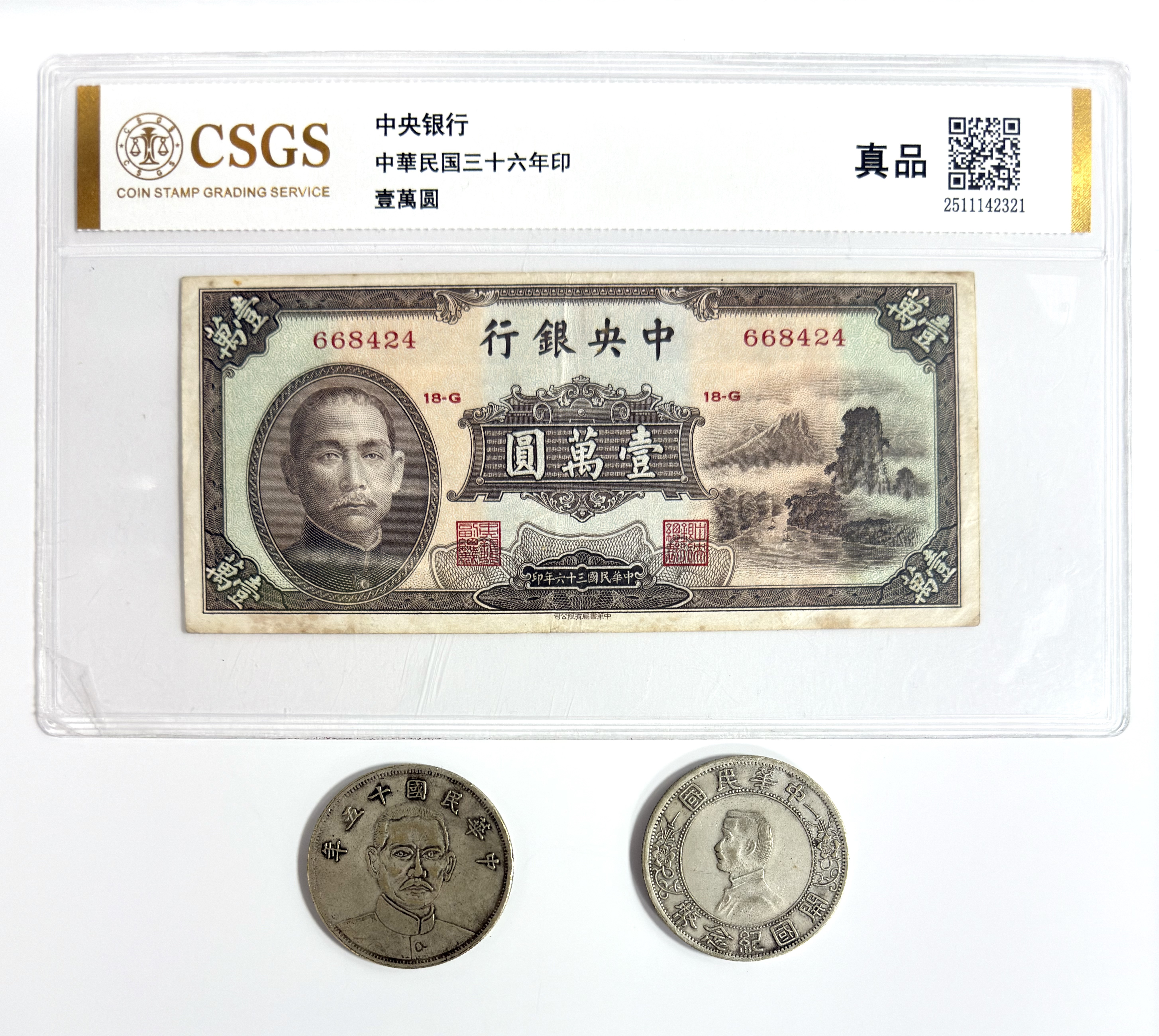 孙中山像钱币组,涵盖纸钞与银币,时代特征鲜明,人物刻画生动。
