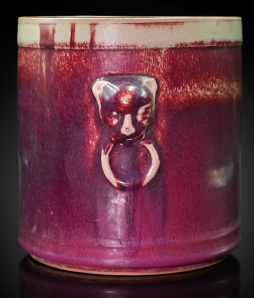 窑变紫红如霞,双兽衔环威仪古雅,底署痕迹清晰,尽显清代仿古瓷艺之精华与文房之雅韵。