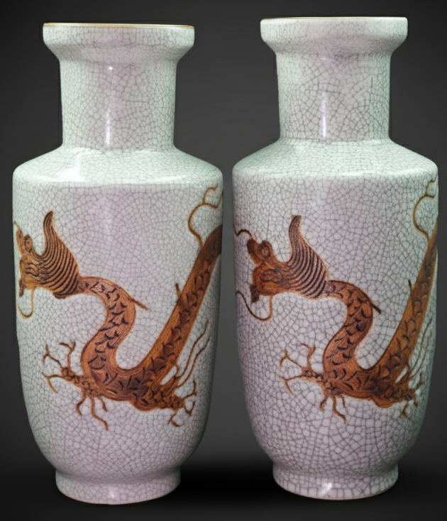 造型端庄,釉色古雅,开片细密,龙纹雄劲生动,底署“寿”字款,工艺精湛,品相极佳。