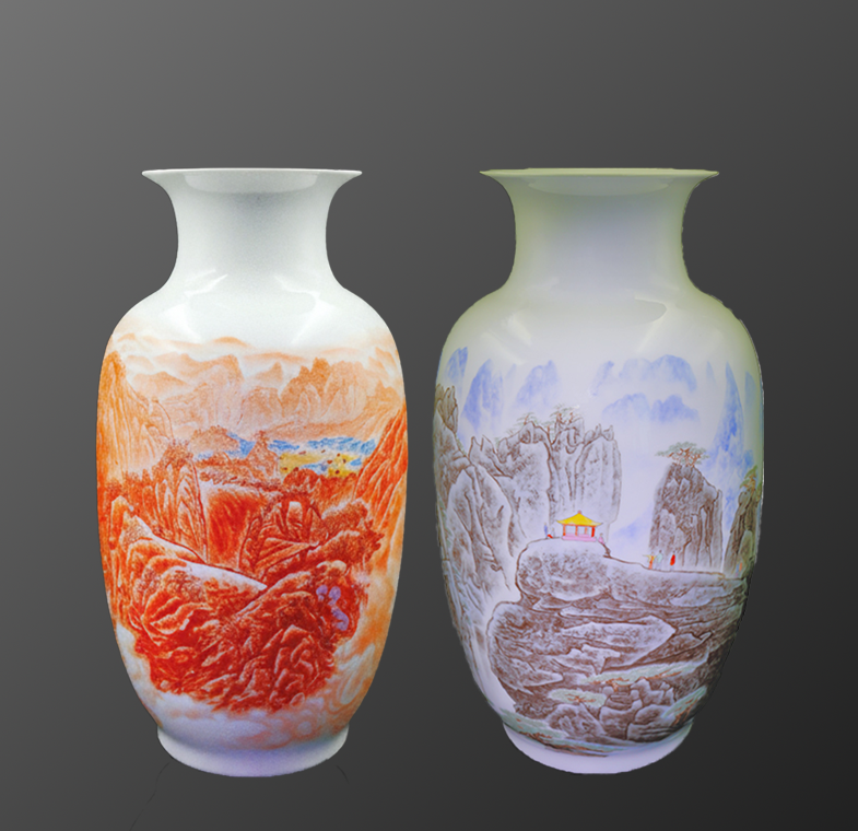 王锡良与王采合作瓷绘《井冈山》《黄山四千仞》。两瓶规格一致,主题深远,既展革命圣地,又绘自然奇观,凝聚当代瓷坛大师父子心血。