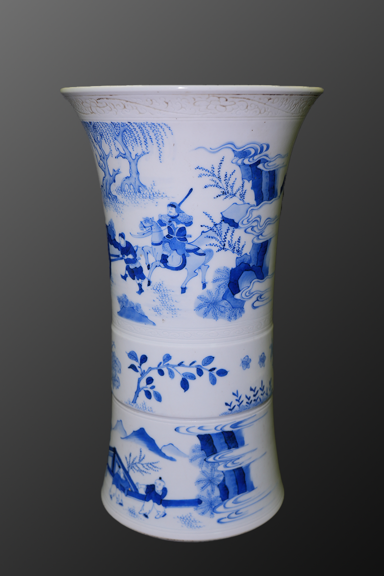 清·顺治青花瓷千里走单骑人物纹花觚,造型端庄,青花发色明快,故事题材寓意忠义仁勇