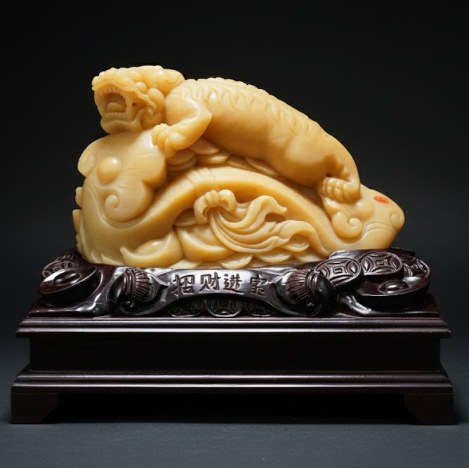 玉质温润金黄,雕工细腻传神,集貔貅招财与如意吉祥于一体,寓意富贵安康、万事顺遂。