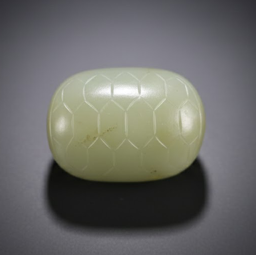玉质温润细腻,龟背蜂窝纹规整细致,底部俏色自然成趣,寓意长寿安康、财源稳固。
