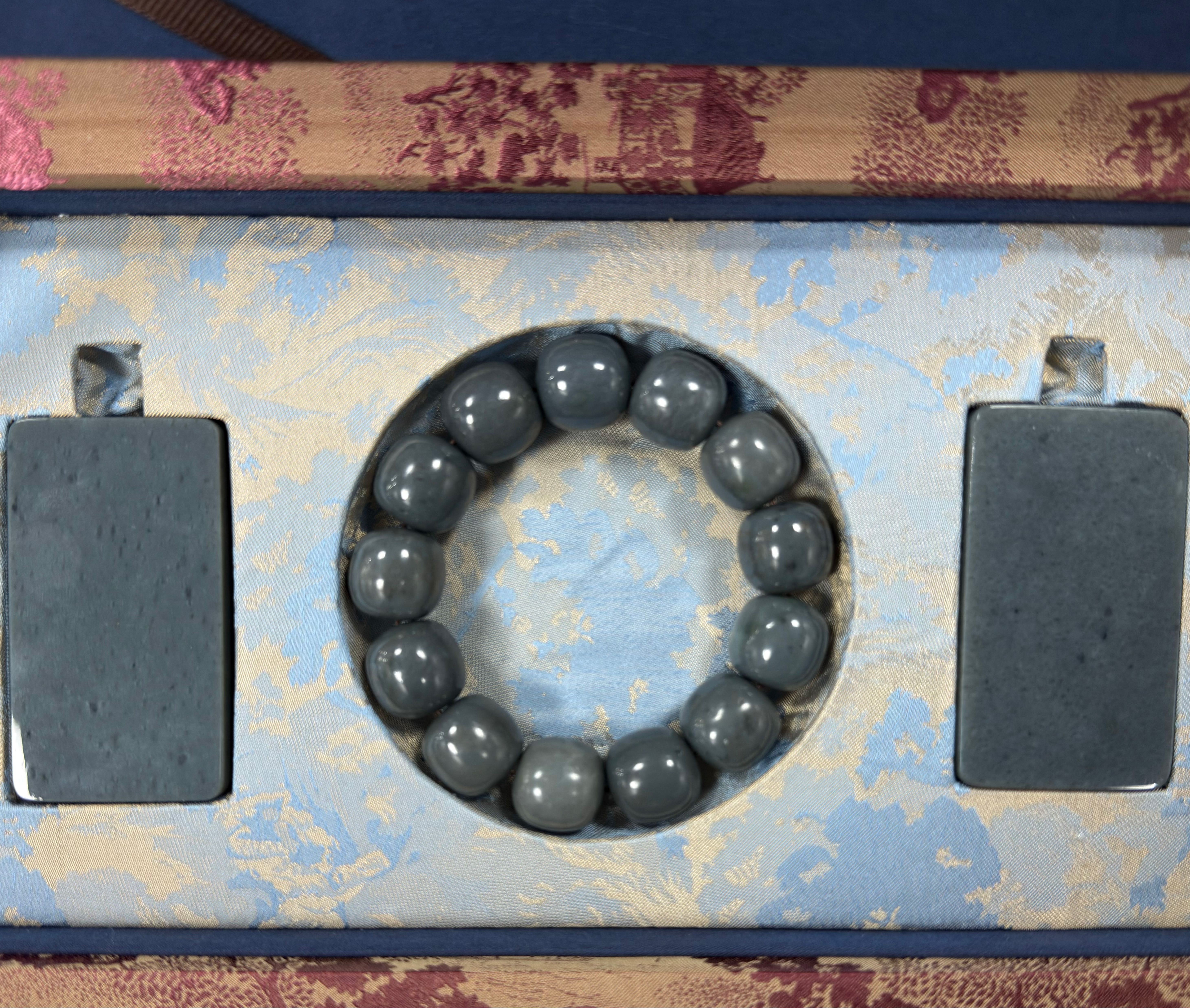 由两枚玉牌与一串手串组成,质地细腻致密、油脂感强。色泽青灰沉稳,温润柔和。