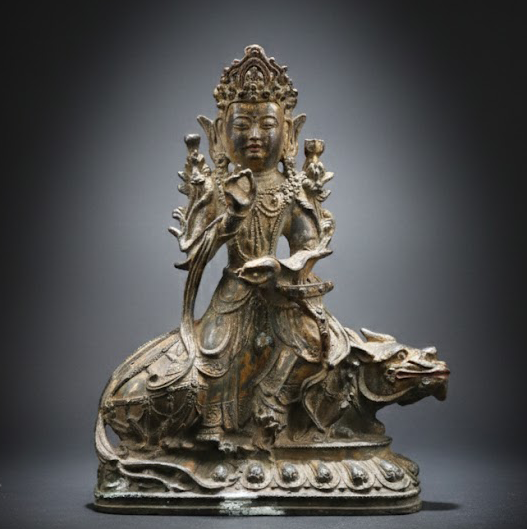 菩萨神态安然慈慧,狮身雄健生动,展现出明代金铜造像艺术的庄严与智慧之美。