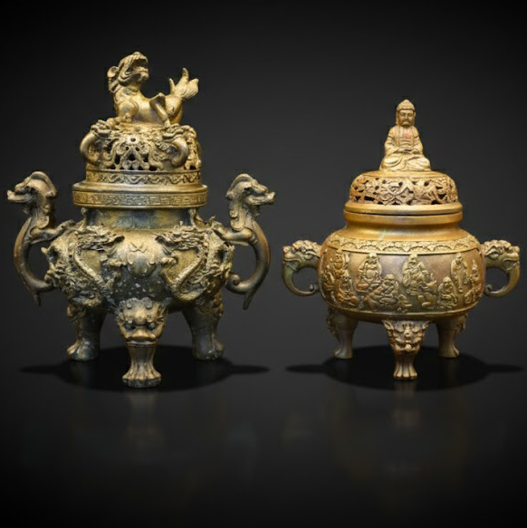 两件大明宣德款铜香炉,一雄一静,龙纹与佛像相映成趣。造型典雅、工艺精湛。
