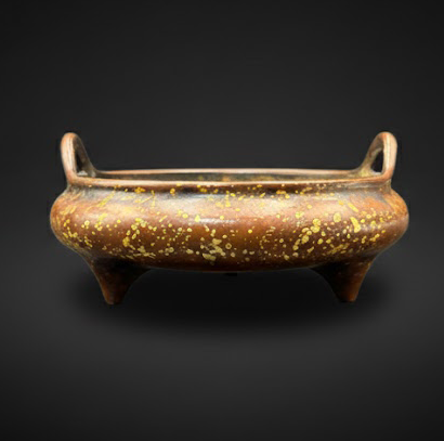 以精铜铸造、洒金装饰,造型端庄雅致。栗壳色皮壳莹润沉稳,桥耳对称,三足鼎立,尽显明代工艺之精。