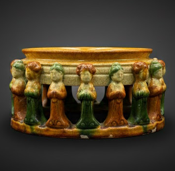 侍女立像环绕支撑,釉色明丽温润,展现出辽代陶艺兼容游牧与中原文化的独特风格。