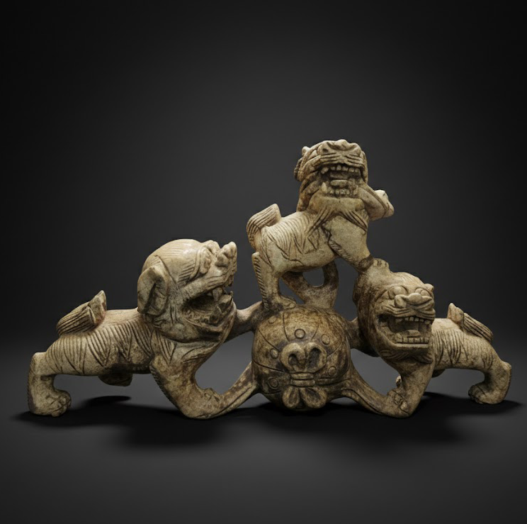 狮围球而戏,象征欢庆太平、家运昌隆。雕工细致,线条流畅,神态灵动