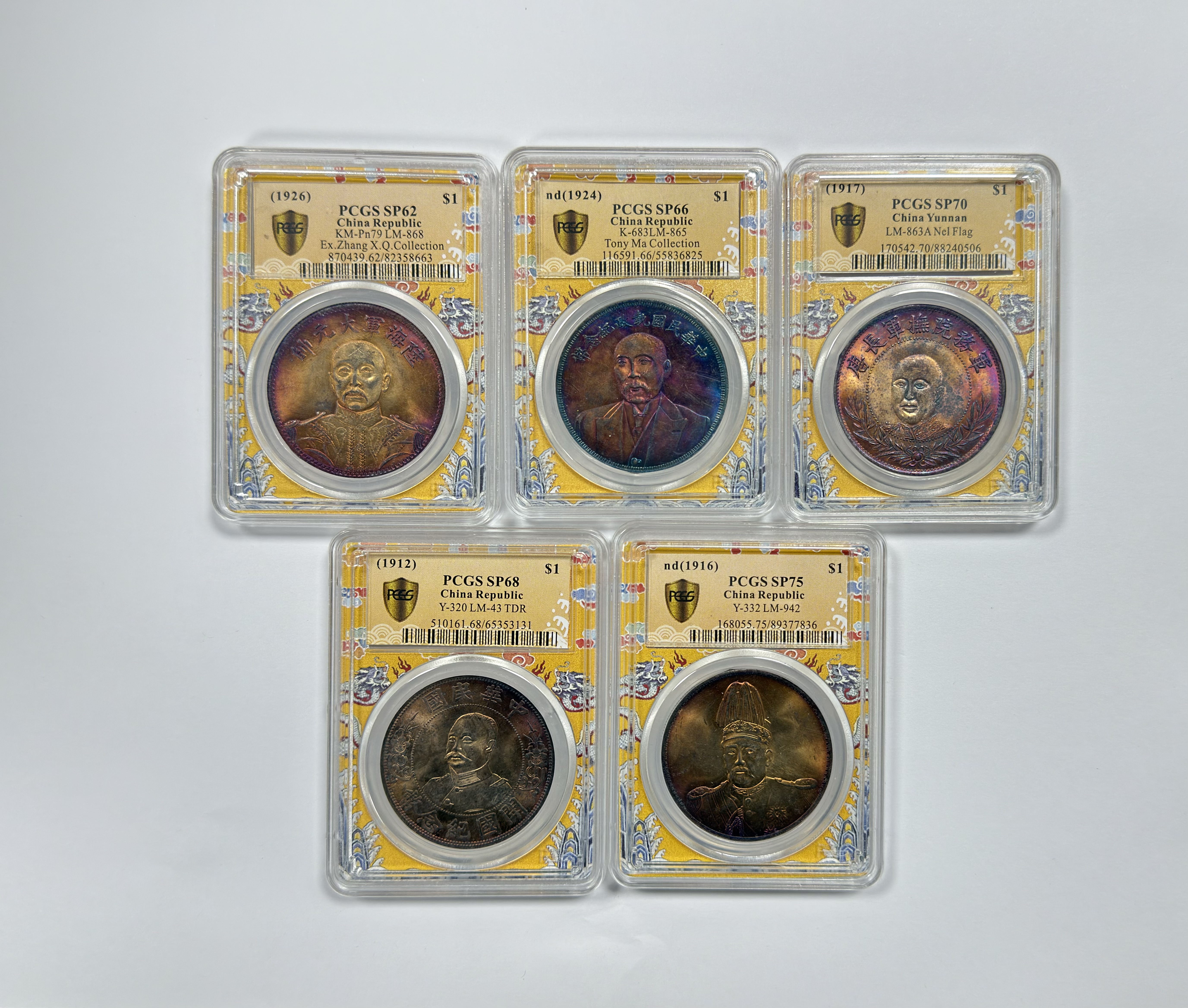 在钱币收藏的璀璨星河中,民国时期的军阀纪念银币无疑是一个承载历史记忆与艺术表达的独特板块。这套包括张作霖、段祺瑞、唐继尧、袁世凯以及曹锟五位历史人物肖像的纪念银币,将上世纪初那段风云变幻的时代气象凝固在方寸银盘之上。每一枚均为样币规格(Specimen),经过国际权威评级机构PCGS的严格评估,涵盖SP70至SP75等满分及高分评级,同时源自张宗宪(Zhang X.Q.)与Tony Ma等名家旧藏,凭借卓越工艺与显赫流传背景,为收藏领域所瞩目。