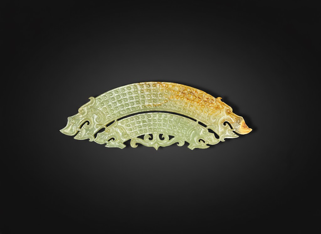 全貌展现出优雅的虹桥式弧形结构,比例匀称而富张力。双龙盘绕于衡两端,动静相依,气韵贯通。重达114.21克的体量赋予了器物稳重的平衡感,正是汉代玉器造型美与精神气象的集中体现。
