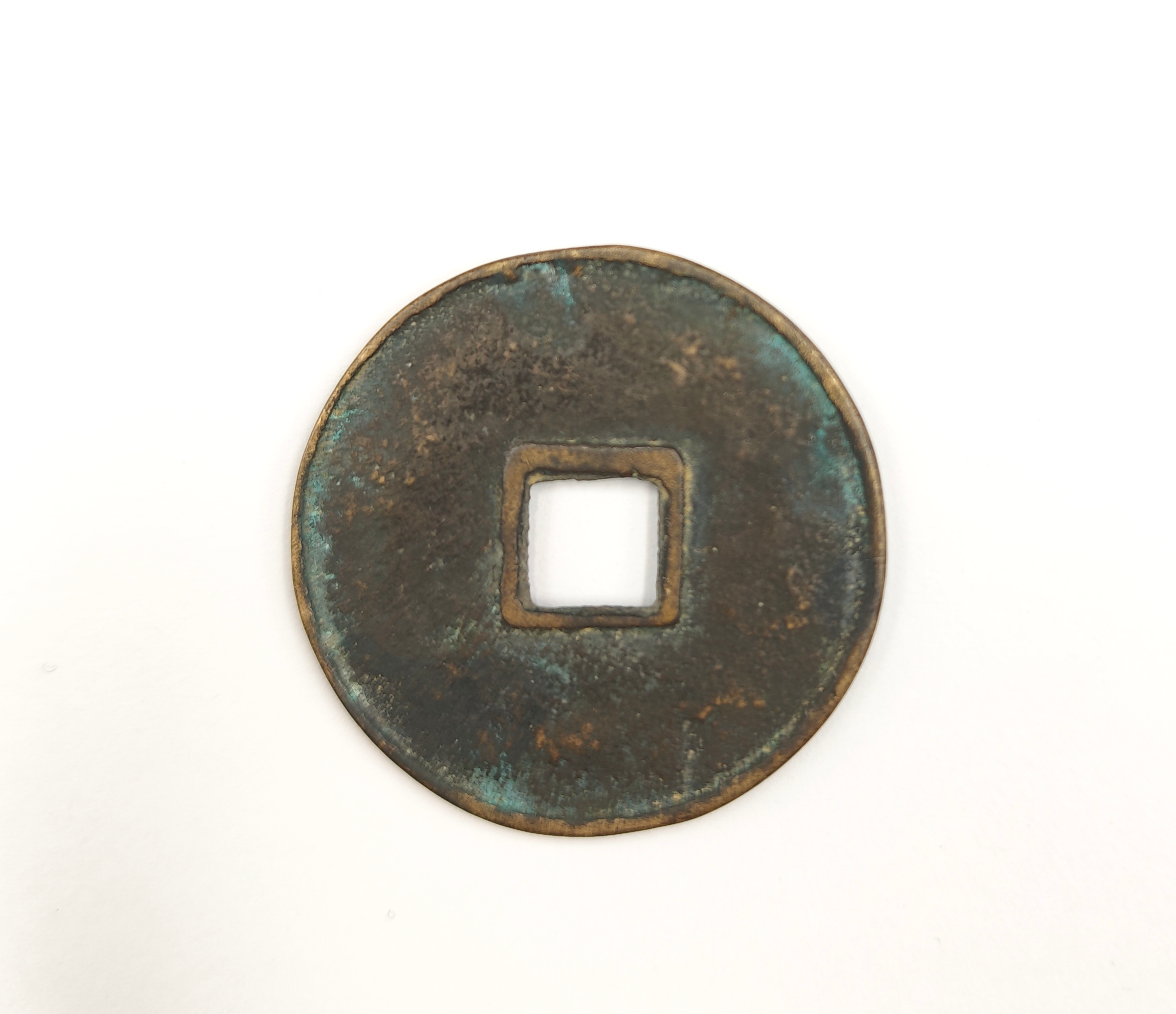 背面地章平整,包浆自然凝厚,呈青绿色光泽。氧化层的色调均匀温润,显露出长年埋藏与岁月流转的痕迹,极具历史质感。