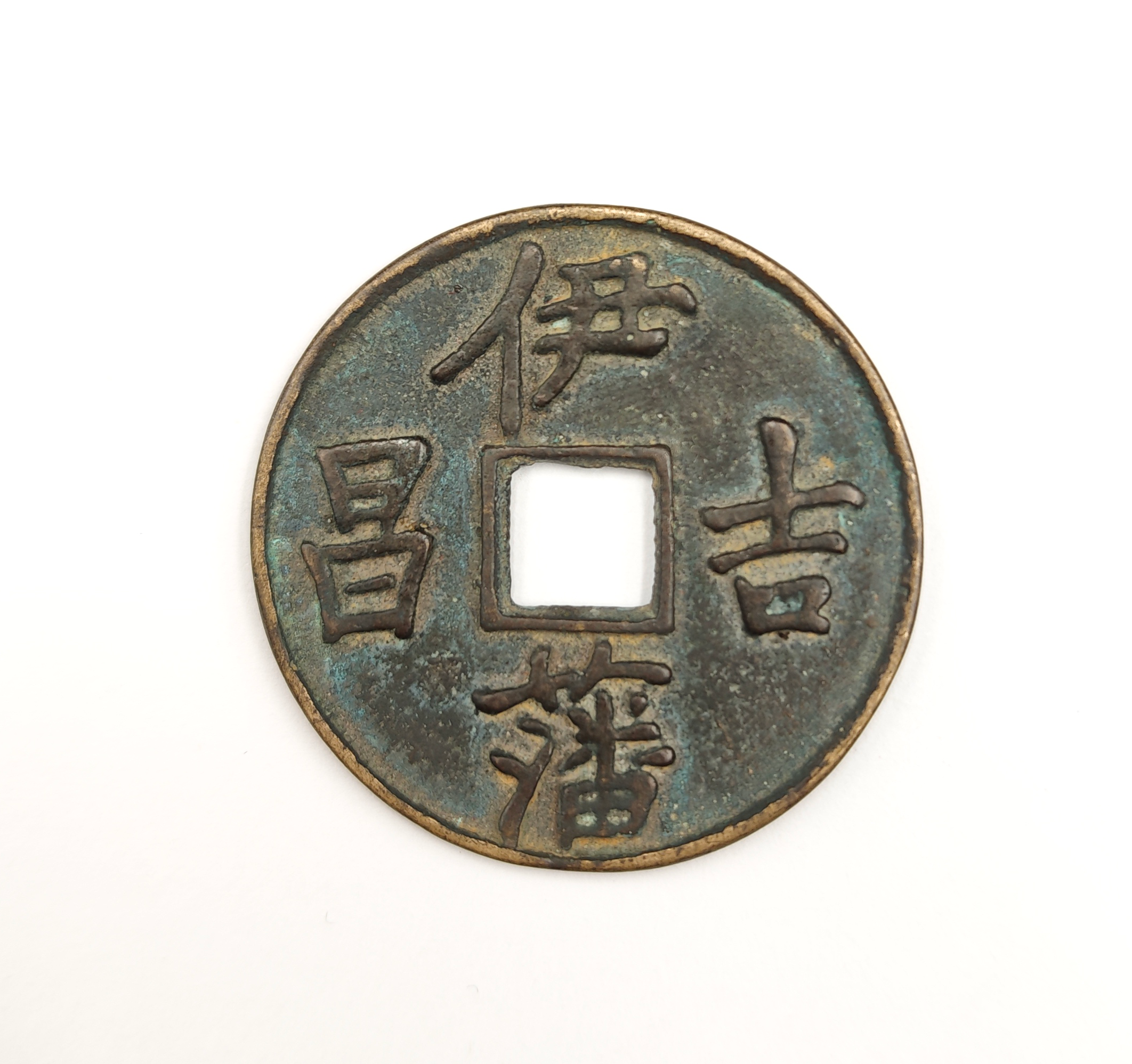 这枚元代伊藩吉昌供养钱,断代为元代(1271年—1368年),形制为方孔圆钱,实测重量 17.54g。此类钱币多用于礼佛供养或藩王赏赐,存世量稀少。其厚重的体量与古朴的包浆,不仅体现出元代铸币工艺的高超水准,更蕴含了当时特有的宗教与藩国文化内涵,是研究元代历史与金属铸造工艺的重要实物。