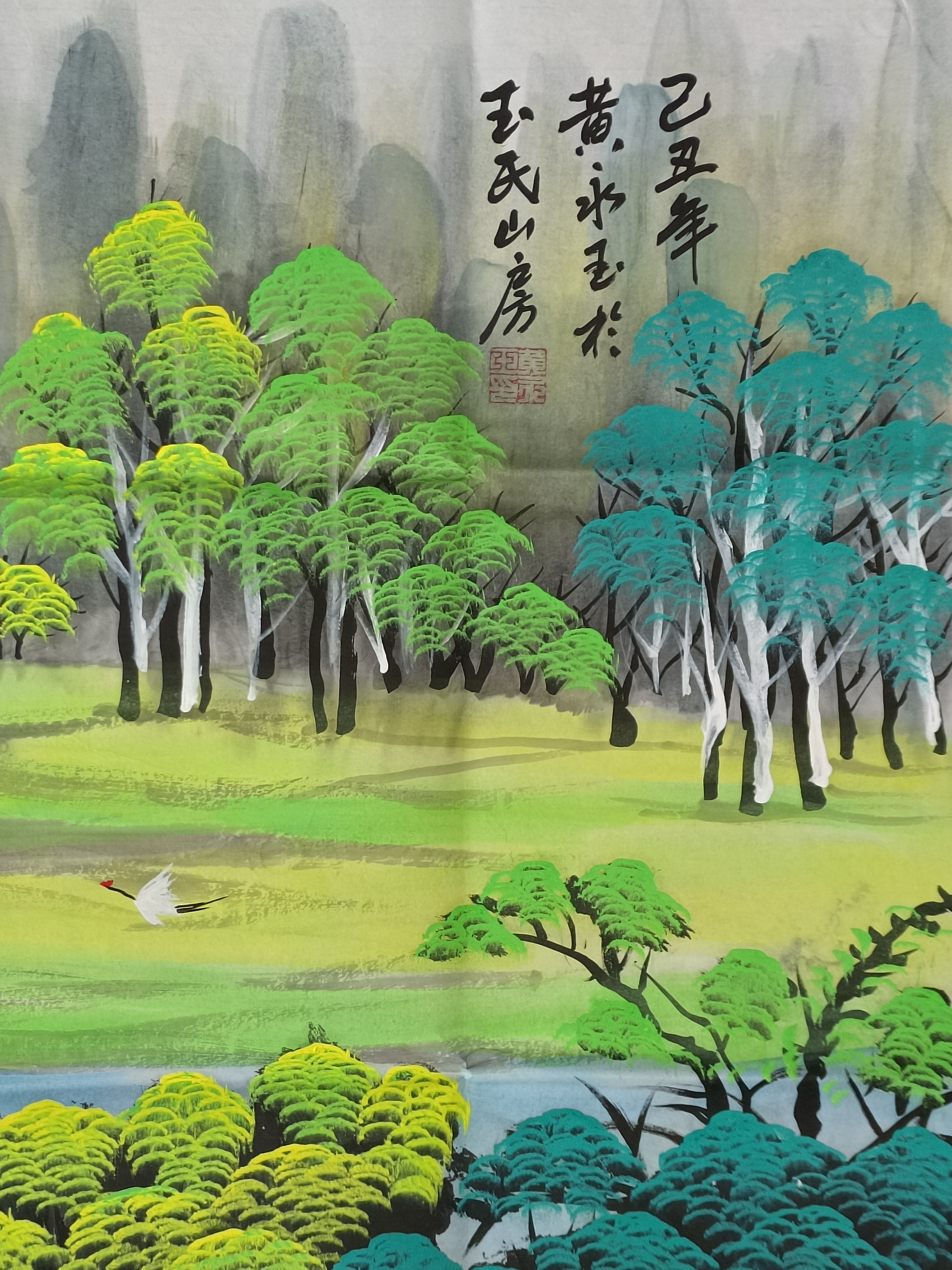 画面右上方可见落款,并钤朱文方印。题识位置经营得当,与画面构图形成视觉呼应。近景林木以彩墨表现,树冠以翠绿、孔雀蓝与明黄色层层点染,色彩鲜明而富于变化。树干则以白粉勾勒,与后方淡墨远山形成虚实对比,既增强了空间层次,也体现出黄永玉山水画中典型的彩墨语言。