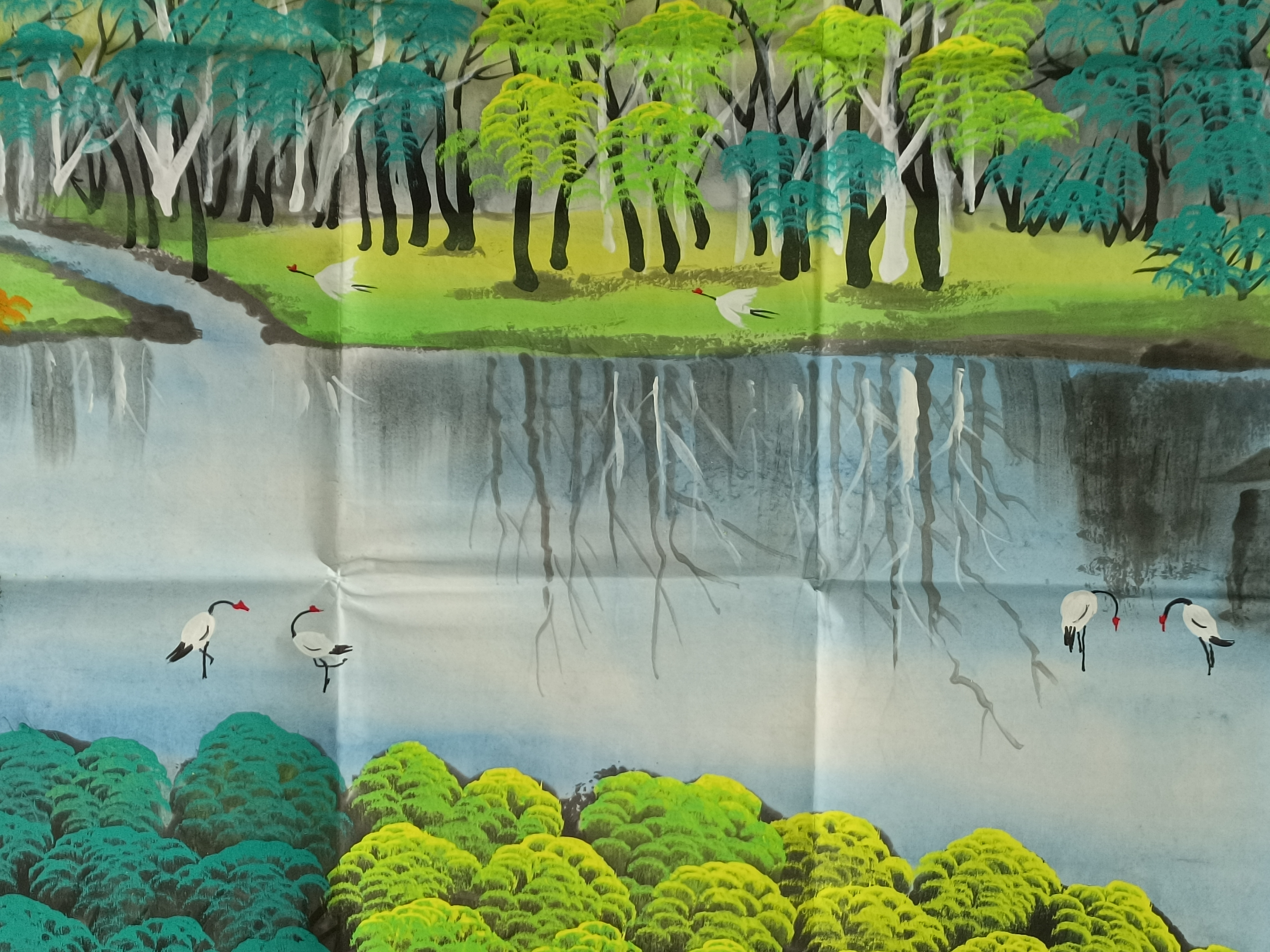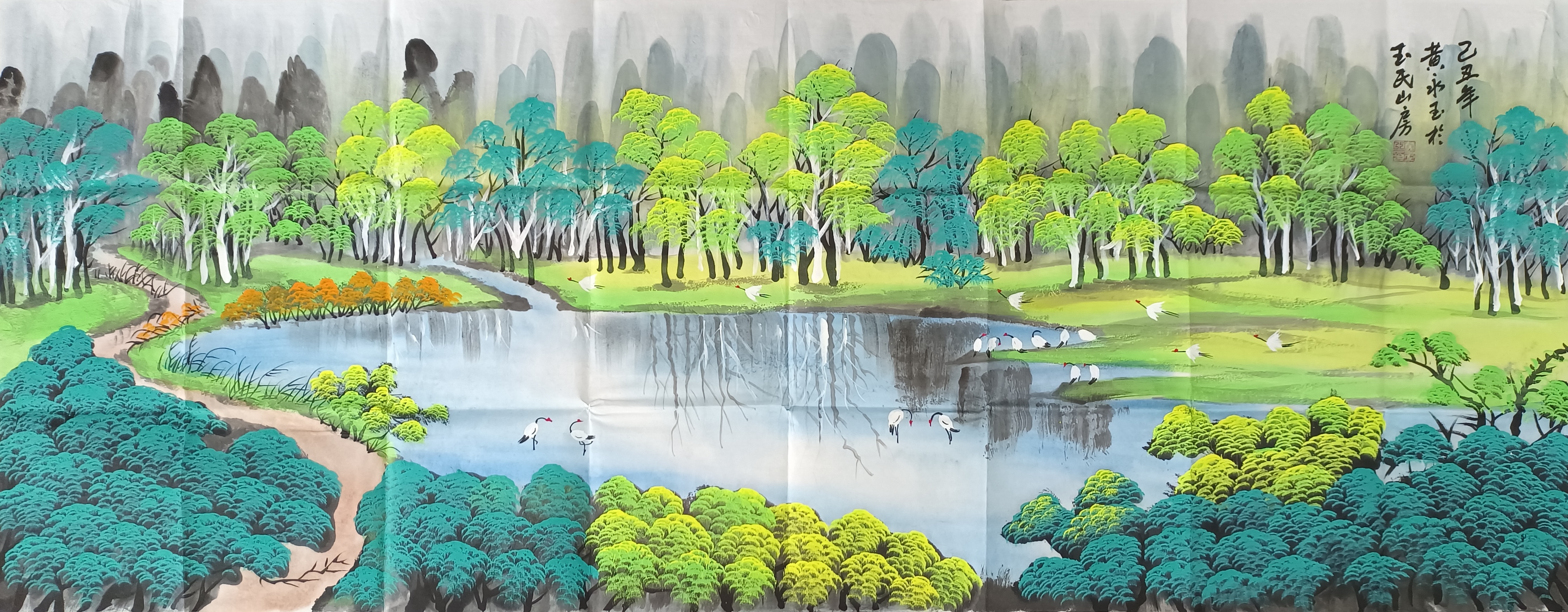 画面中心处为开阔的湖面,水色澄静,倒映岸边树影,营造出虚实相生的空间效果。湖畔数只白鹤点缀其间,或悠然踱步,或低头觅食,姿态自然生动。白鹤在传统文化中常寓意清雅与长寿,在此不仅丰富了画面内容,也为山水意境注入灵动气息,使静谧的自然景观呈现出“动中有静”的艺术韵味。