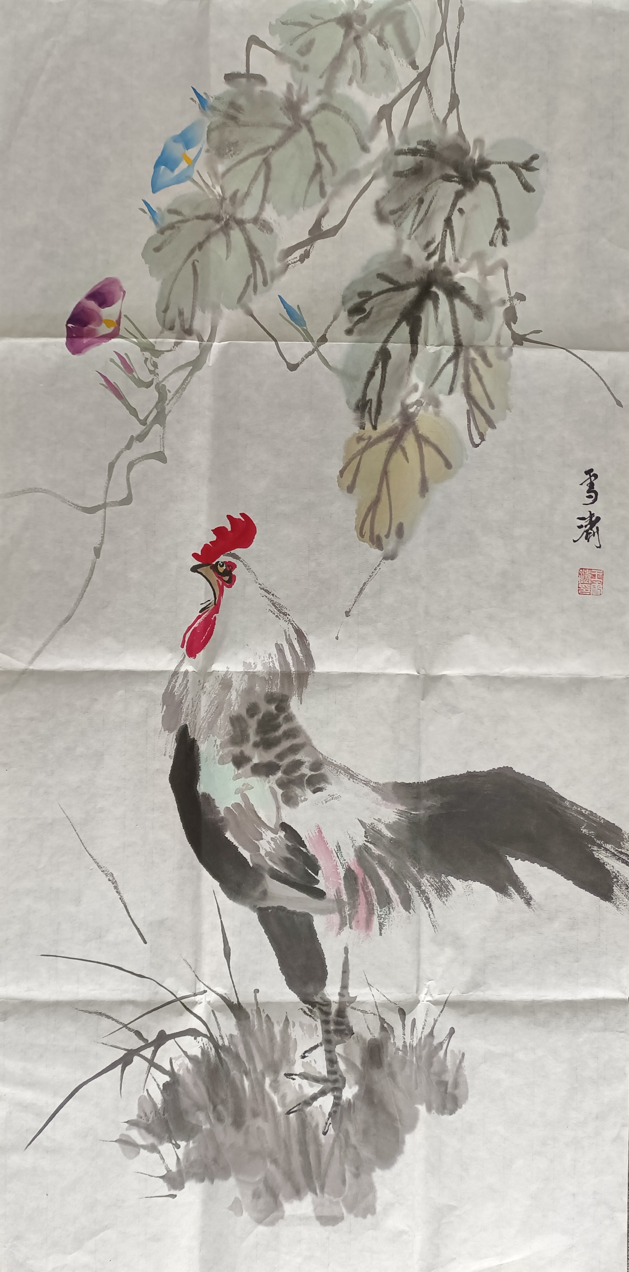 本幅作品纵 99cm,横 49.7cm。画面以一只昂首而立的雄鸡为主体,上方配以盛开的牵牛花藤蔓,形成上下呼应的构图关系。公鸡在中国民间文化中象征“大吉大利”,而牵牛花又寓意顽强与蓬勃的生命力。画家通过写意笔墨将二者结合,使整幅作品既具有传统吉祥寓意,又洋溢着自然清新的田园气息。画面疏密有致、虚实相生,既显笔墨功力,也体现出小写意花鸟画特有的灵动神韵。