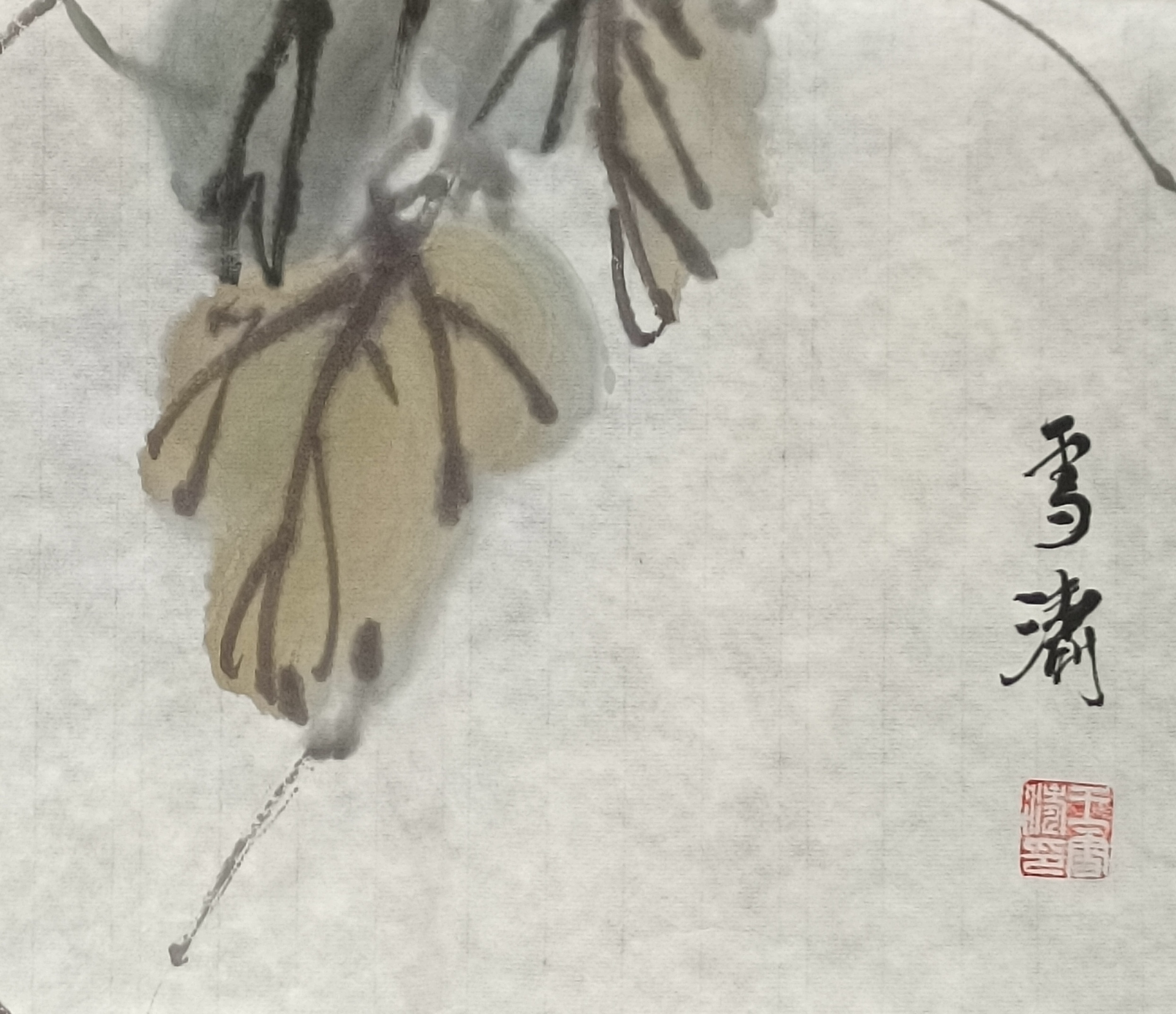 画面右侧题款“雪涛”二字,行书笔意流畅,线条劲健而不失飘逸。落款下方钤盖一枚方形白文印章,与题字相互呼应,使画面右侧形成稳定的视觉重心。简洁的题款方式既体现了画家的个性,也保持了画面整体的清雅气息。
