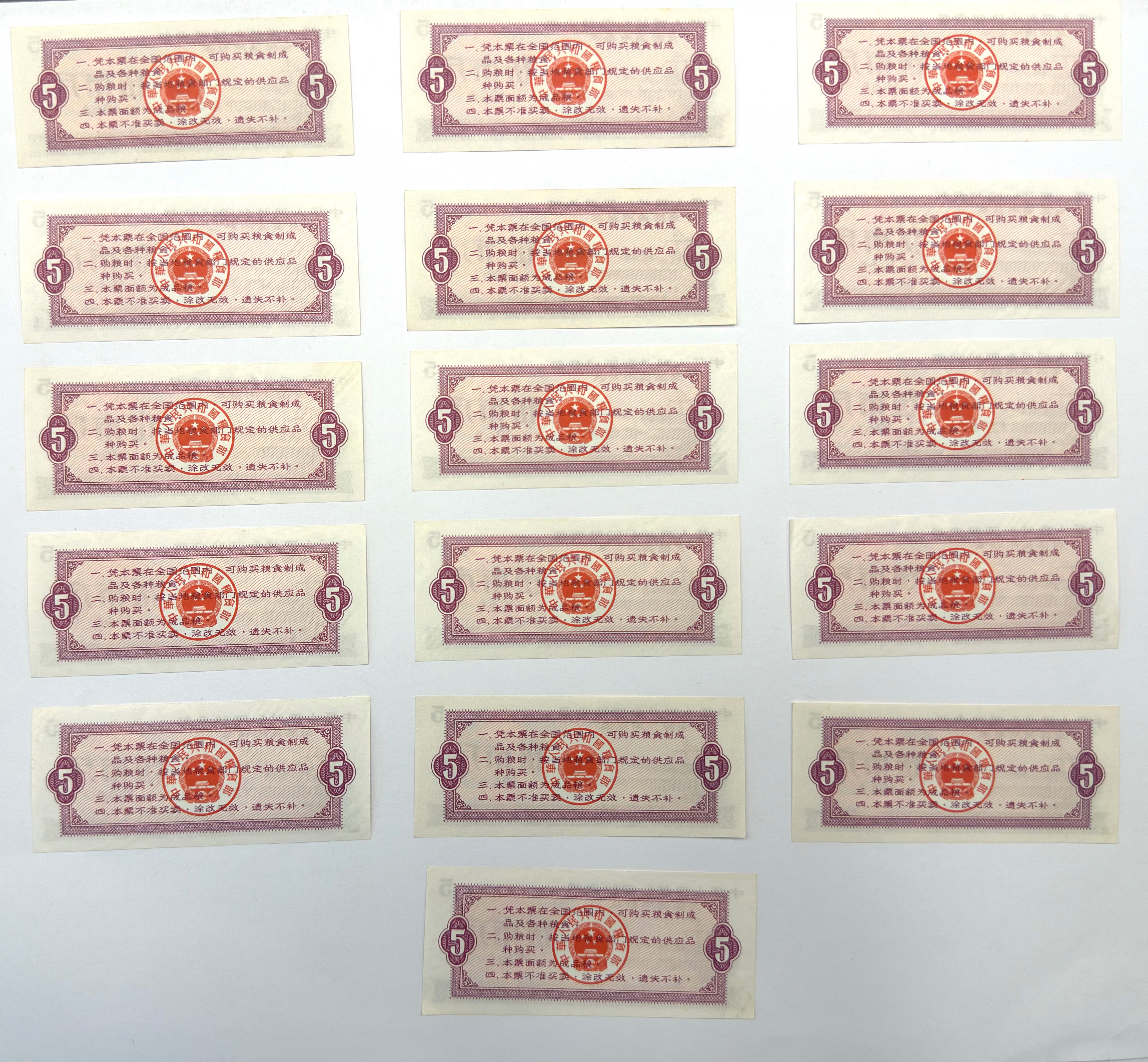 这组藏品为1966年版中华人民共和国粮食部全国通用粮票,共16张,面额为伍市斤,单张尺寸长约9厘米、宽约3.8厘米。该票由国家粮食部门统一发行,是计划经济时期用于购买粮食及粮食制品的重要凭证,在当时具有类似“配给凭证”的功能。20世纪60年代,我国实行粮食统购统销制度,居民在购买粮食时需要同时使用现金与粮票,因此粮票成为日常生活中不可或缺的重要票证之一