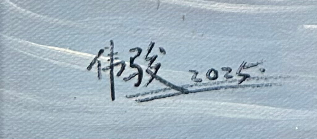 画面左下角可见艺术家的亲笔签名“伟骏”及创作年份“2025”。沉稳有力的墨色签名不仅标识了作品的作者身份,也为画面增添了一处视觉重心。在柔和静谧的自然景象中,这一简洁而明确的署名与画面形成微妙的平衡,使整幅作品在艺术表达与作者印记之间达成和谐统一。