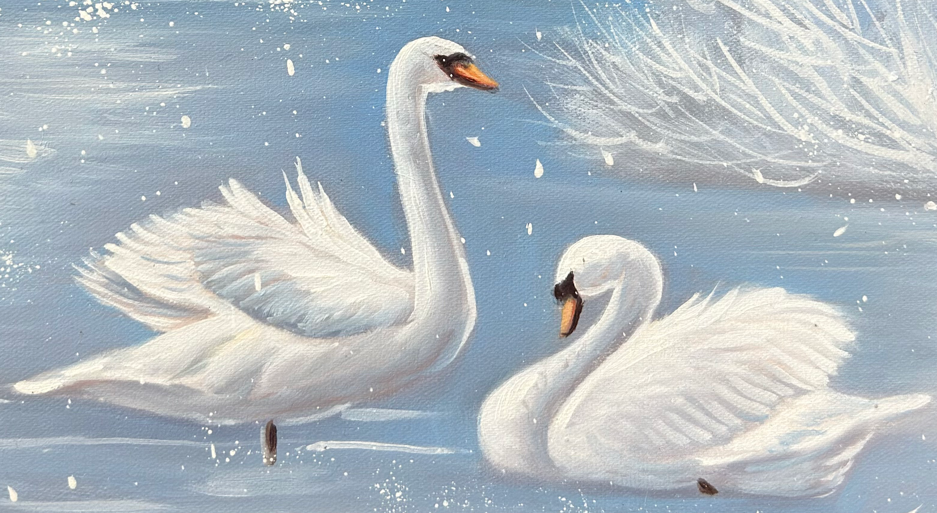 在细节处理上,艺术家对天鹅羽翼的刻画尤为细致。通过油彩层层叠加的技法,羽毛的柔软质感被生动呈现出来,既有轻盈舒展的形态,又保留了油画特有的厚重肌理。湖面细微的水纹与光影变化亦被巧妙描绘,使微风掠过水面的粼粼波光跃然于画布之上。这种细腻而富有层次的表现方式,使整幅作品既具真实感,又富有艺术表现力。