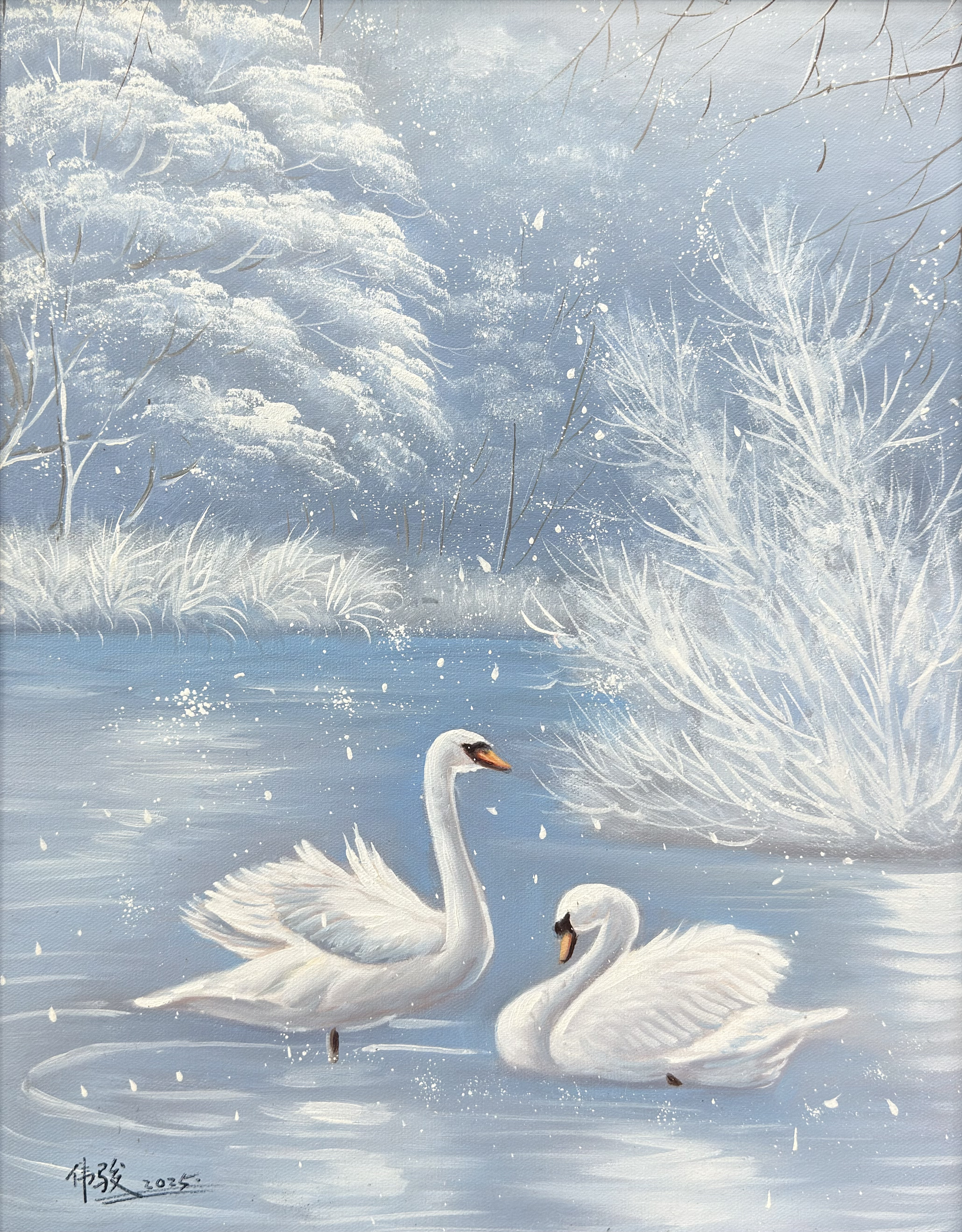 画面全景呈现出一片银装素裹的湖畔景象。冰蓝色的湖水在冬日微光中泛起柔和的光泽,两只洁白的天鹅悠然游弋其间,姿态从容而安然。岸边树木覆满霜雪,形成晶莹剔透的雾凇景观,与湖面倒影相互映衬,使整幅画面在静谧之中流露出清冷而纯净的美感。艺术家通过简洁而精准的构图,使天鹅成为视觉中心,同时也强化了湖面空间的开阔与宁静。