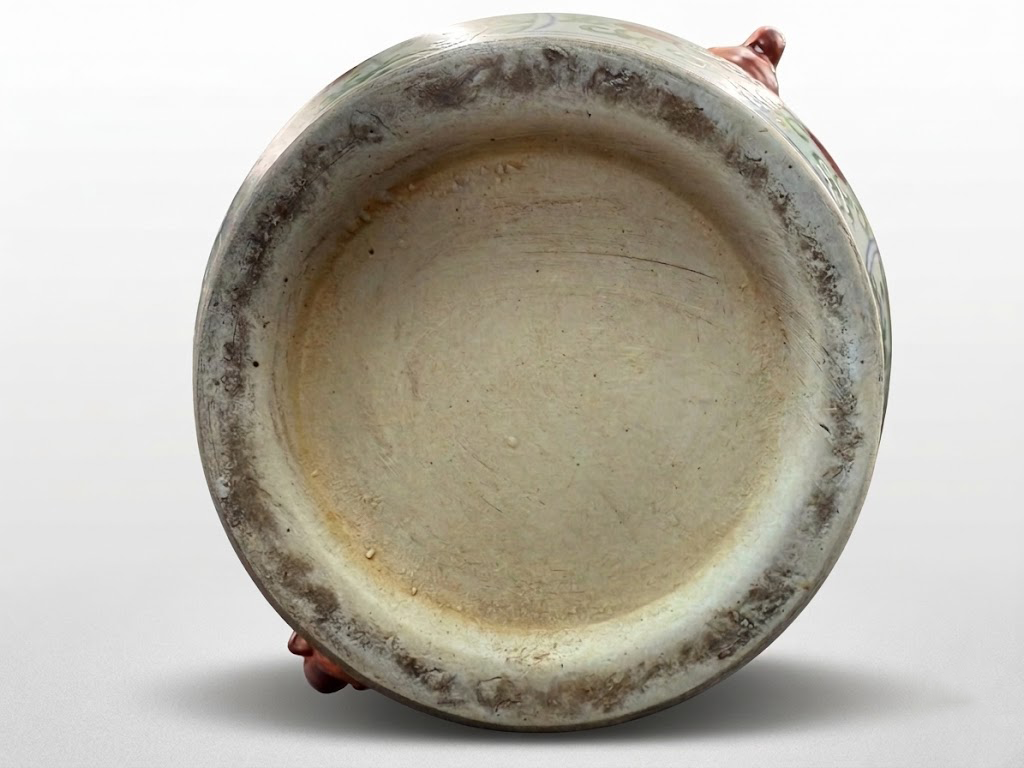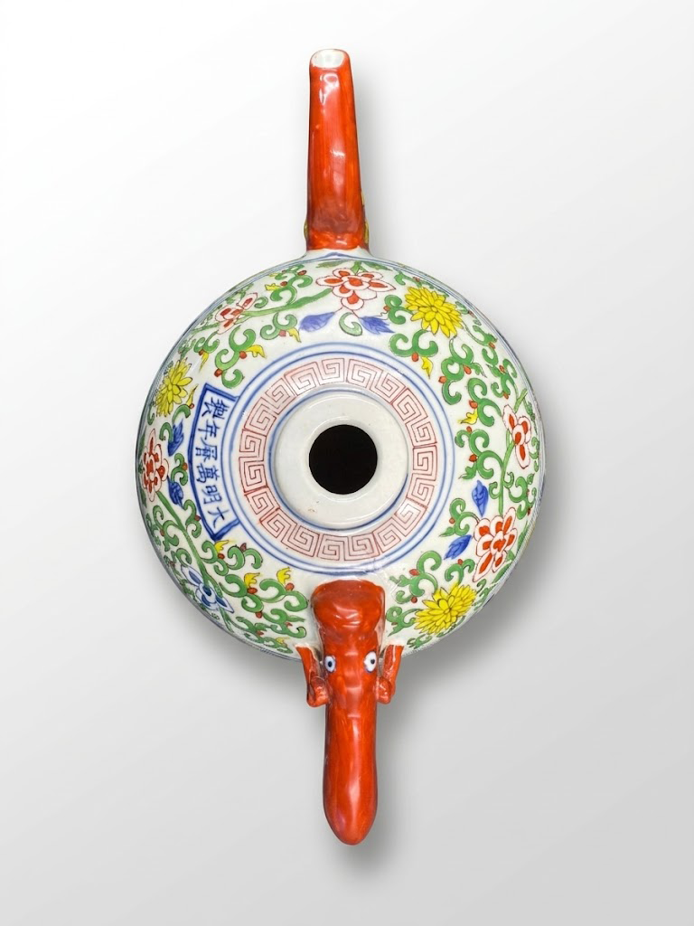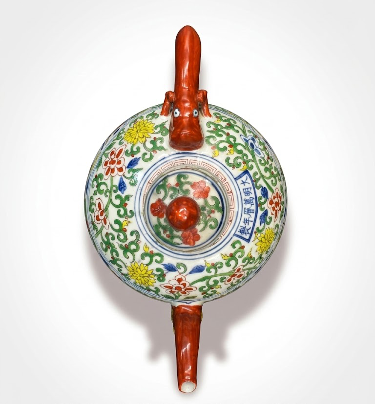 壶盖与盖钮装饰同样精细,红釉兽形钮与壶身花卉纹样相互呼应,使整体视觉更加统一。盖部结构紧凑而富于层次,既增强了器物的观赏性,也体现出匠人对多种彩料叠施与烧造控制的娴熟技艺。