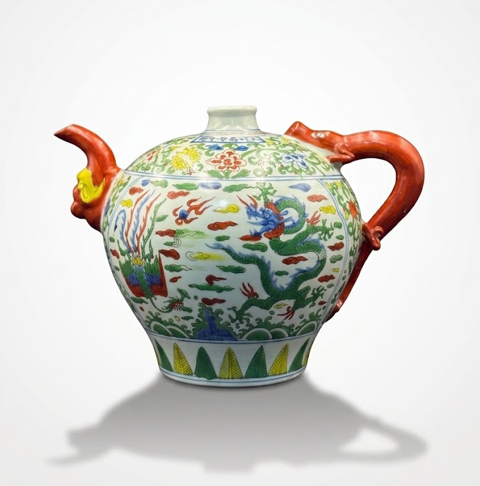 壶身装饰龙凤纹样,寓意吉祥尊贵,而流、柄部位则巧妙塑作兽首与龙形,使器物在实用器型之中融入浓厚的装饰意味,体现出万历时期瓷器工艺追求繁丽与气势的审美取向。