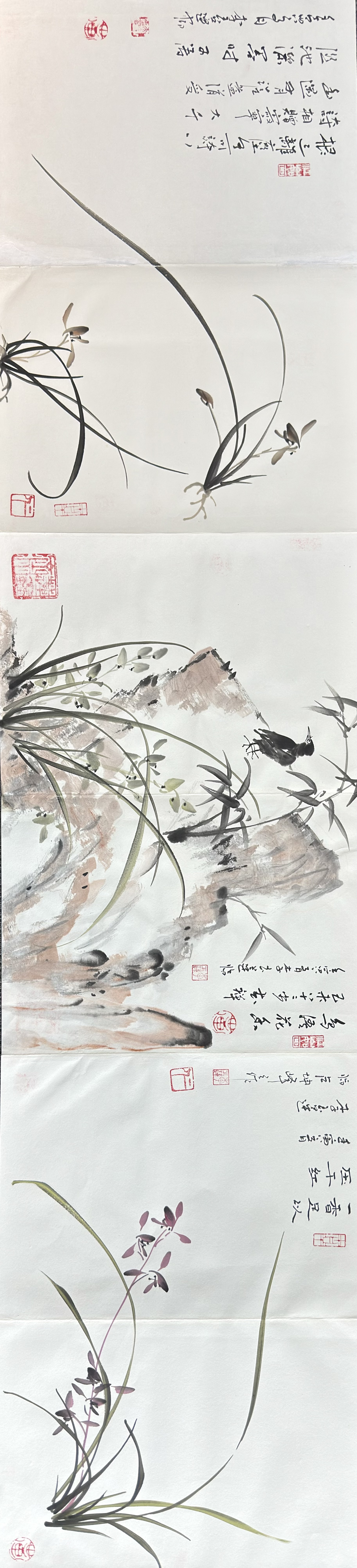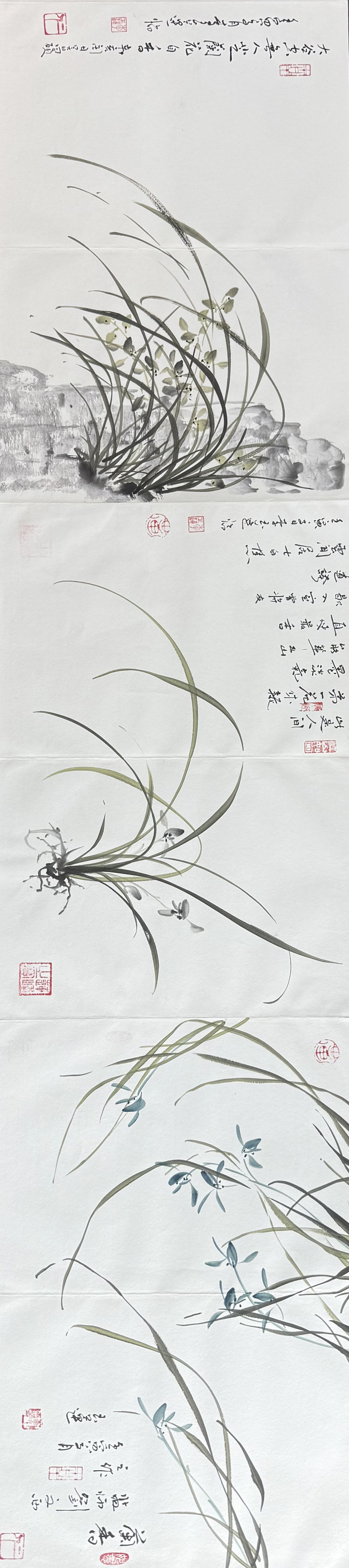 整幅《兰花集锦》通过长卷形式将不同姿态的兰花依次铺陈,既有山野幽兰的清逸气息,也有案头清供的文人雅趣。画家以流畅的笔墨线条与含蓄的设色,表现兰花高洁、坚韧与幽香的品格,使作品在传统花鸟画的审美框架中展现出浓厚的人文气息与艺术格调。
