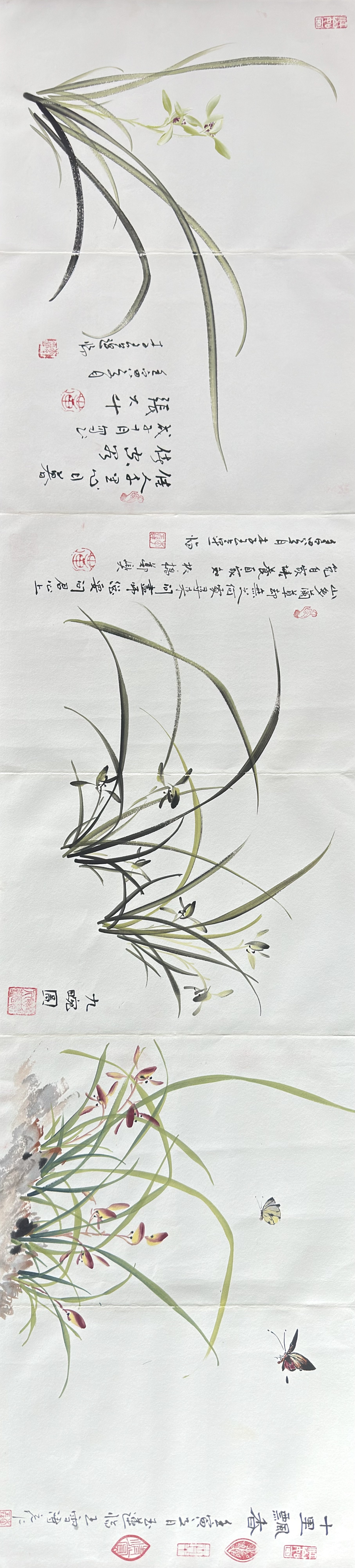 画面由三段兰花构成。上段以简练墨线勾勒兰叶,叶势飘逸舒展,淡绿色点染花心,气息清新。中段兰草丛生,叶片纵横交错,层次分明。下段色彩渐趋丰富,以朱砂与藤黄点染花朵,并绘有飞舞的蝴蝶穿行其间,呈现出春日山野间兰香四溢的生机景象。