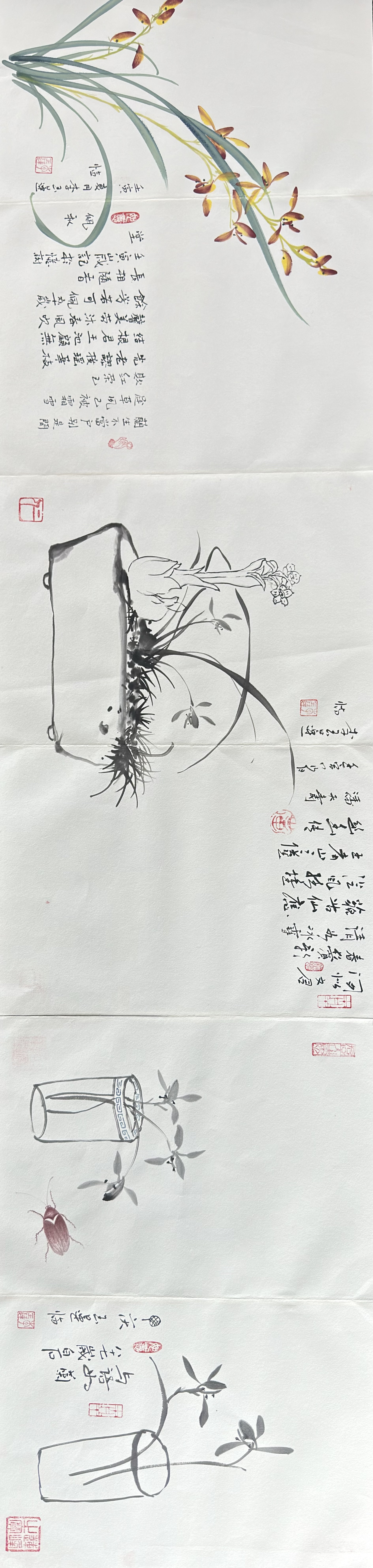 这一部分将兰花从山野引入案头。上段描绘兰叶垂落的自然姿态,线条柔韧而富有节奏。中段则以盆景形式呈现兰花,配以菖蒲等植物,构图端稳,充满文人案头清供的意味。下段写意地描绘兰花插于透明花瓶之中,瓶旁一只小虫缓缓爬行,使画面在高雅之中增添几分生活气息。