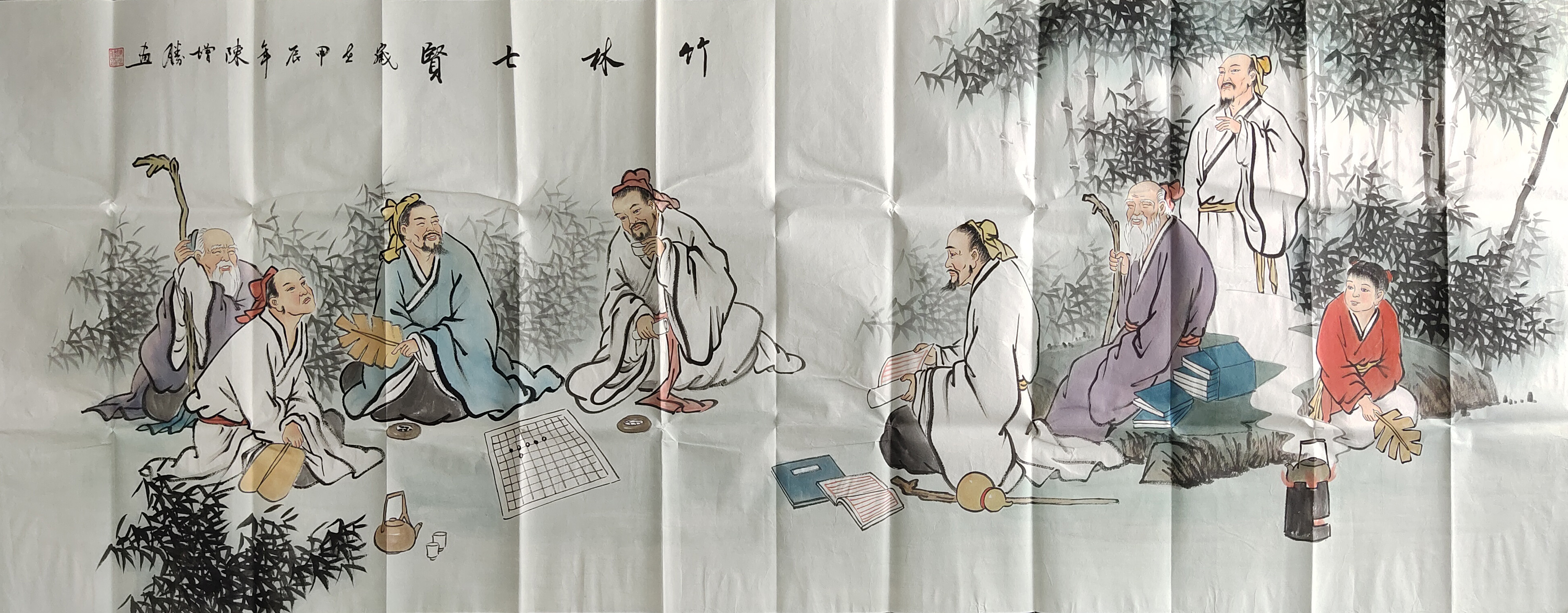 魏晋之际,名士风流成为中国文化史上一段独具气质的篇章。“竹林七贤”以其洒脱不羁、崇尚自然的精神形象,成为历代文人墨客反复表现的重要题材。画家陈增胜先生创作的《竹林七贤》正是以这一历史典故为主题,通过生动的笔墨再现魏晋名士的风骨与气度。