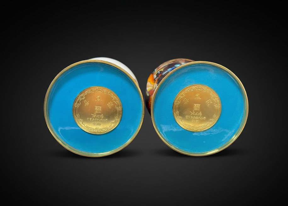 对瓶底部采用经典蓝釉封底,中心镶嵌金色铭牌,上刻“凤舞九天”作品名称及张同禄大师印章,并附有专属编号。这样的款识设计不仅增强了作品的艺术完整性,也体现出大师监制作品所具有的明确身份标识。