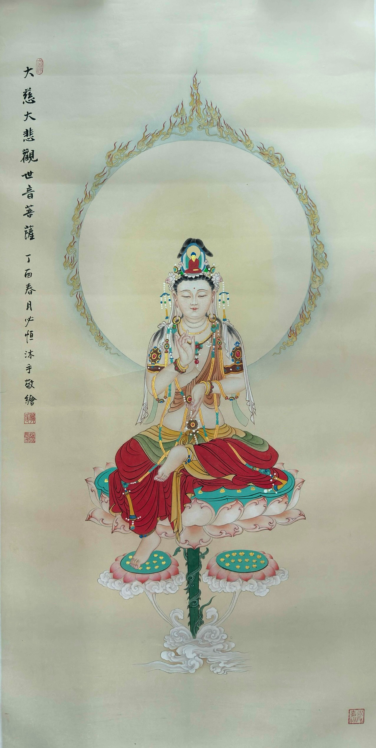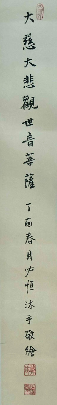 作品落款以书法题写“大慈大悲观世音菩萨”,笔力沉稳,气韵沉静。款识记有“丁酉春月必恒沐手敬绘”,表明画者在创作之时以恭敬清净之心入笔,将宗教信仰与艺术创作融为一体。墨色书写与朱印相互映衬,使画面在庄重的佛教意境之外,亦流露出文人书画特有的气息与格调。