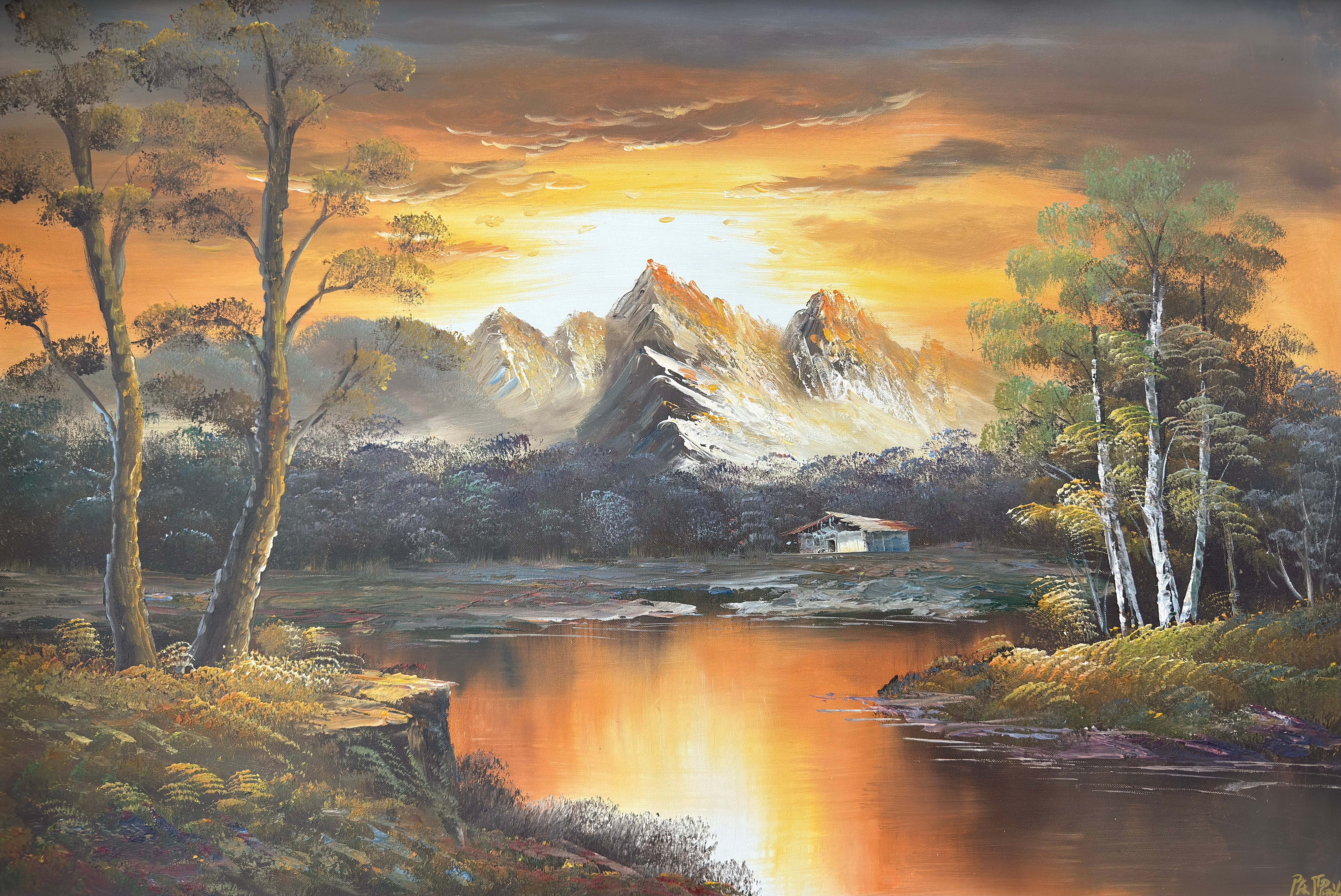 从整体构图来看,作品以远山、湖泊与人居环境构成一个和谐统一的自然空间。远处的雪山巍峨壮丽,与近处平静的湖面形成对比与呼应。湖畔依山而建的小屋,为宏阔的自然景观注入了一丝温暖的人间气息。夕阳西下,金色的光辉洒落在湖面之上,水面泛起细腻的光影变化,使整个画面弥漫着宁静而悠远的氛围,仿佛将观者带入一个远离喧嚣的理想栖居之地。