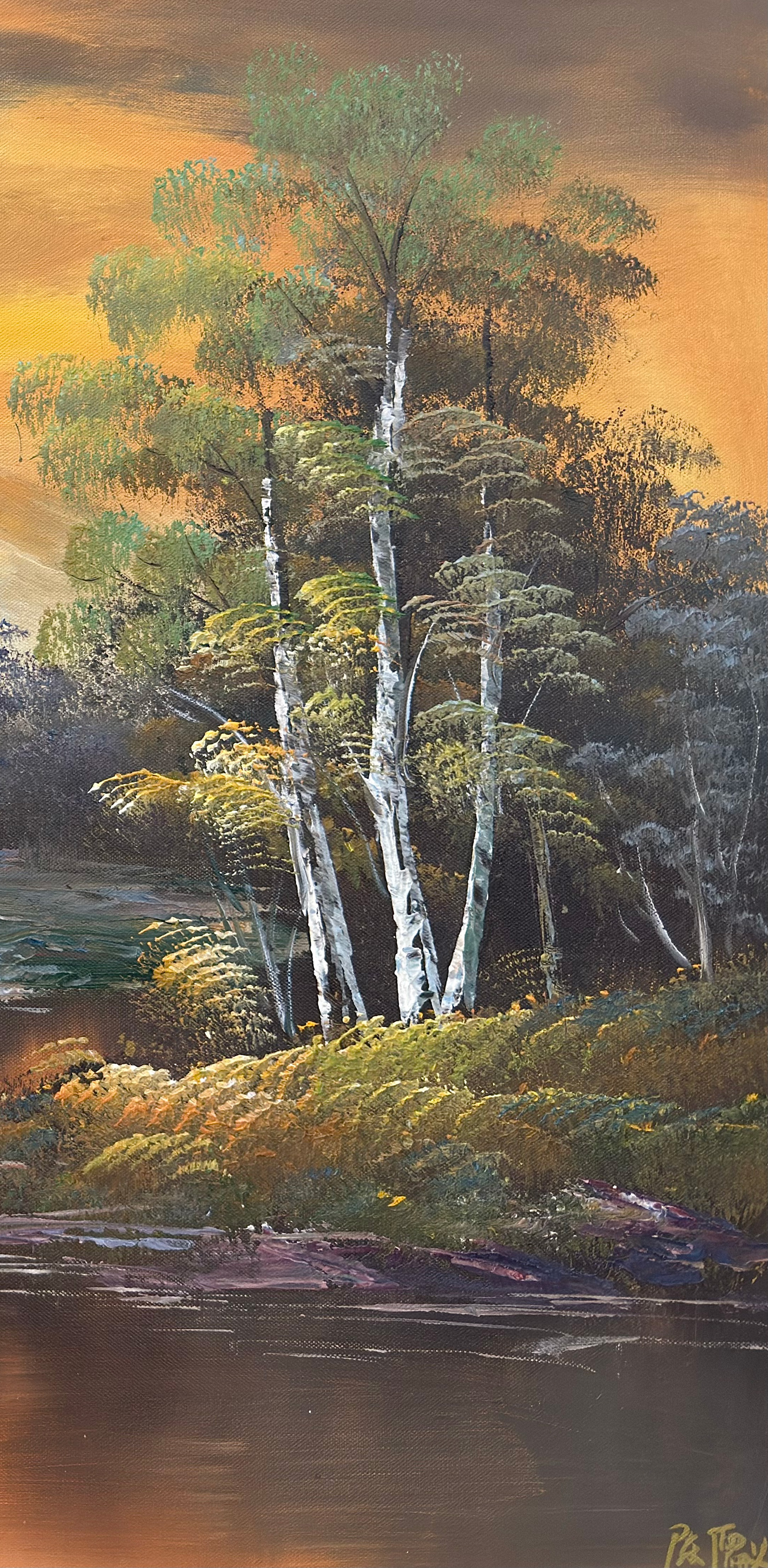 作品右侧描绘了一片挺拔的白桦树林,树干修长而富有节奏感,洁白的树皮在夕阳余晖的映照下呈现出柔和而温润的光泽。艺术家通过细腻的笔触刻画树干的质感,并以层层叠叠的枝叶营造出丰富的空间层次,使画面既具有真实的自然气息,又展现出独特的装饰性美感。白桦林所呈现出的坚韧与挺拔,也为整幅作品增添了一种象征性的生命力量。