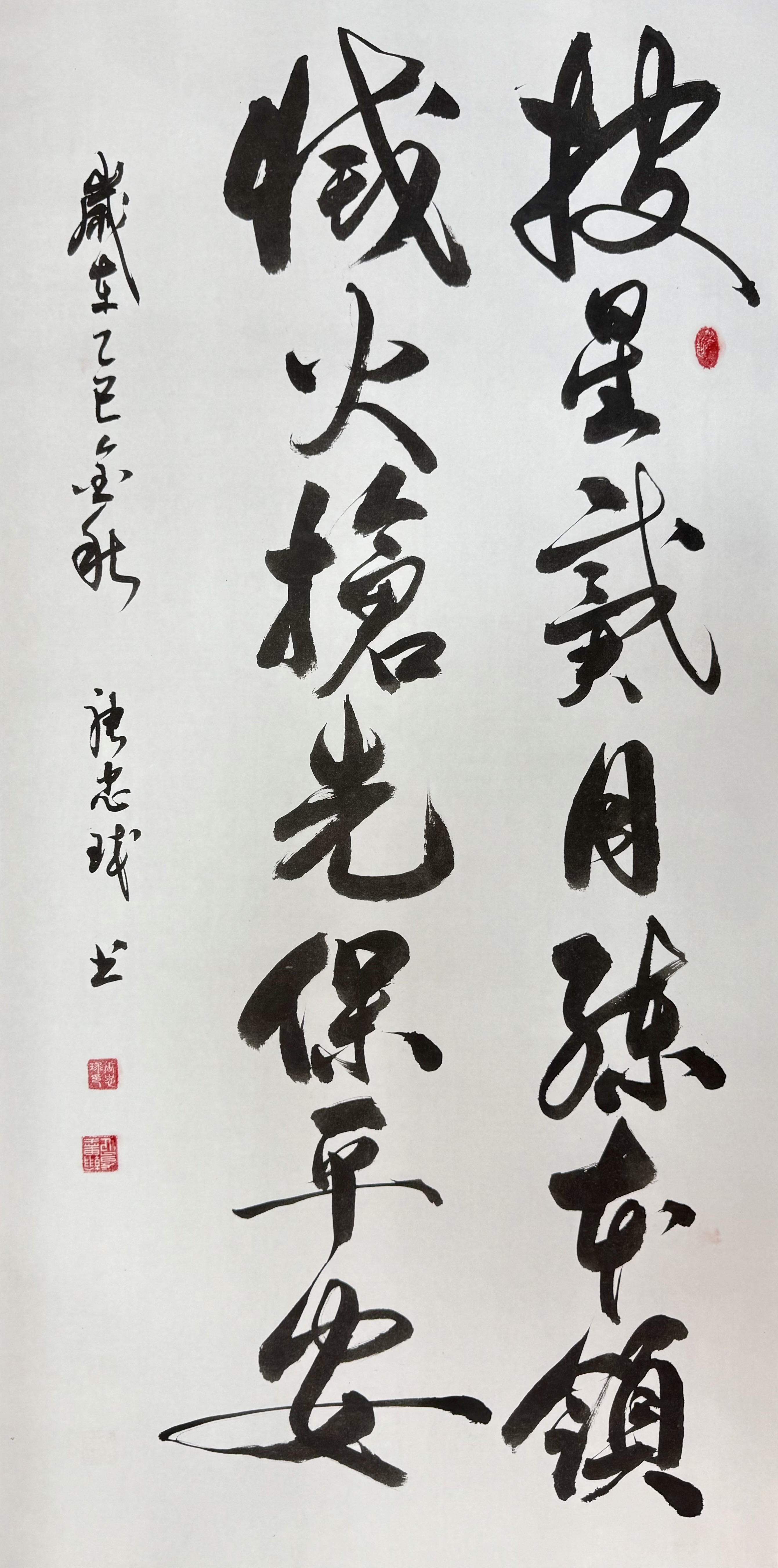 在传统书法的审美体系中,行草书以其兼具法度与性情的表达,一直被视为最具生命力的书体之一。这组由书法家唐忠球创作的行草书作品,尺寸为137cm × 68cm,通幅气势开张,用笔沉稳而富有变化,在章法与笔意之间取得了良好的平衡,披星戴月练本领,灭火抢先保平安,呈现出颇具感染力的艺术张力。