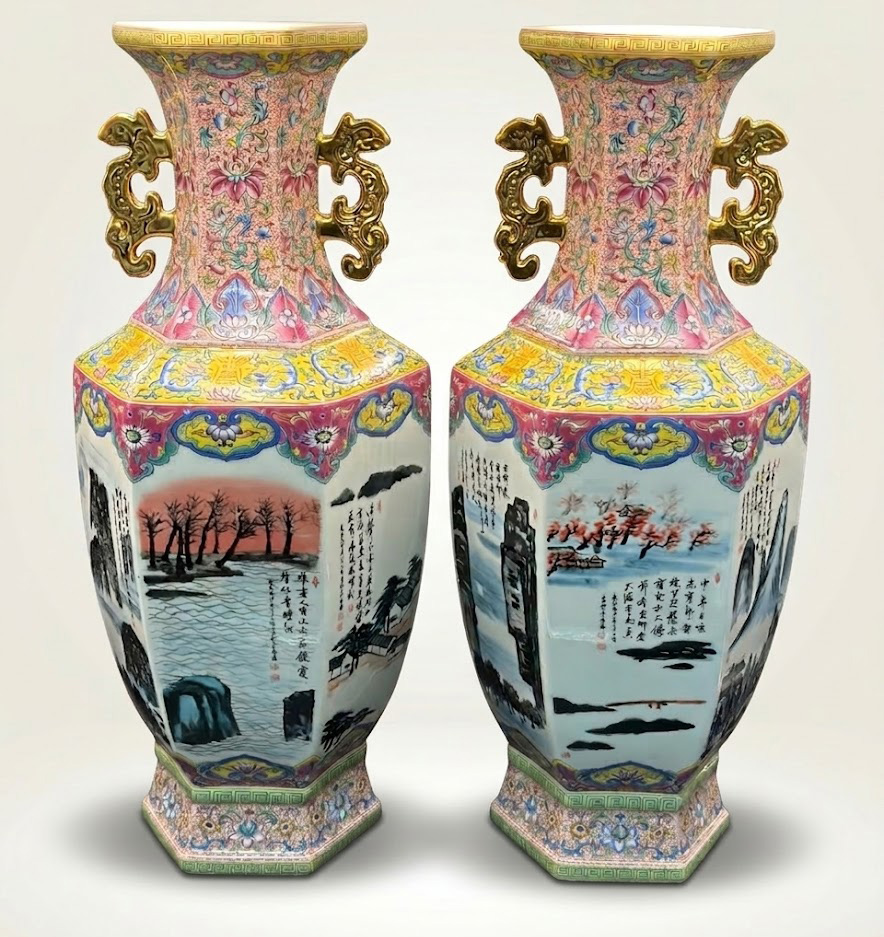 整器采用六方对称造型,线条挺拔利落,结构严谨稳重。瓶颈部位饰以描金双螭龙耳,既承袭传统陈设器的礼制意味,又在视觉上形成灵动点缀。瓶身以开光布局,将不同画面分置其间,使空间层次更加分明,整体观感既庄重典雅,又富于变化,体现出传统器型语言在当代语境中的再生与转化。
