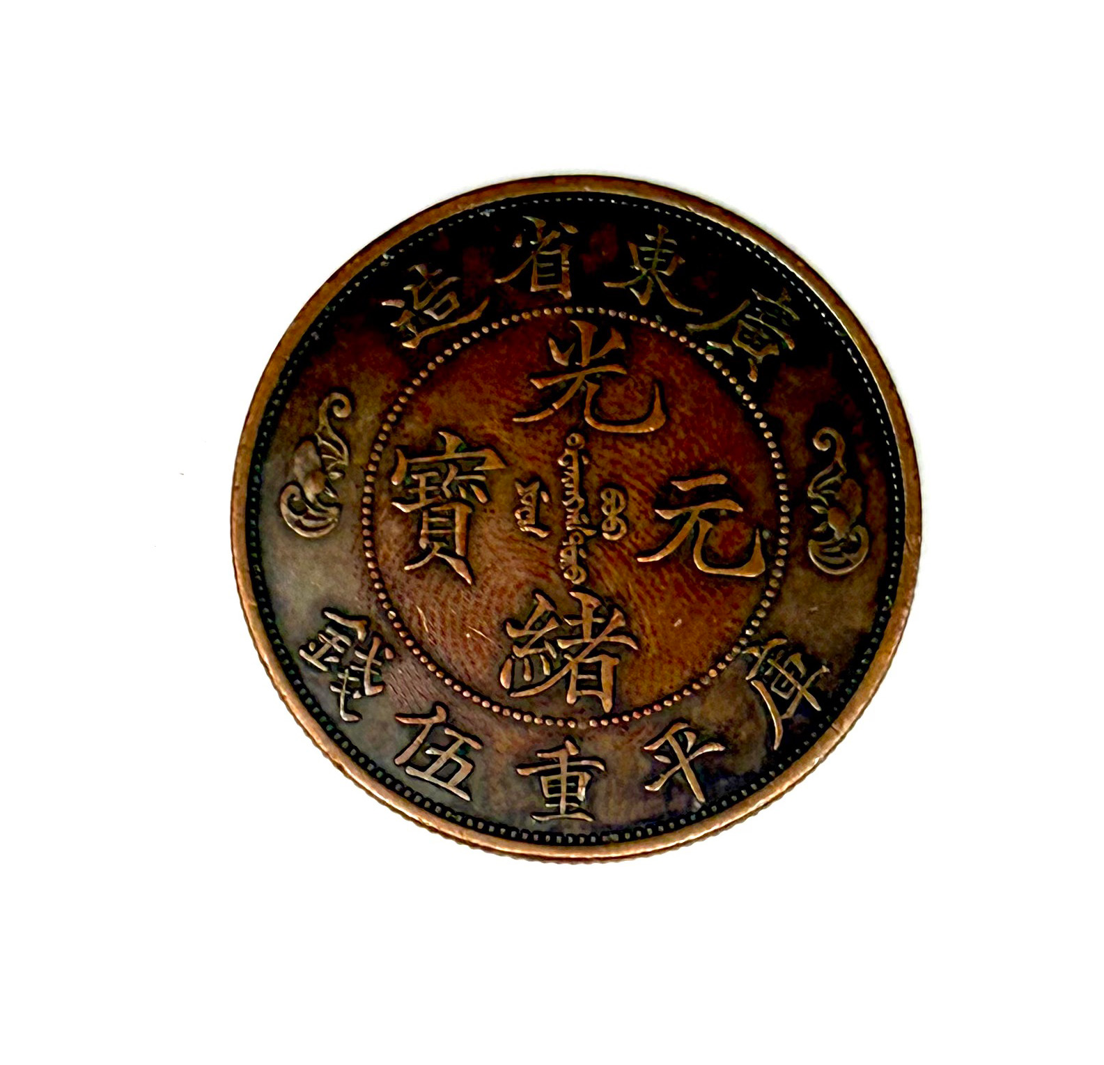 币面整体布局严整有序,珠圈之内以楷书铸写“光绪元宝”四字,笔画端庄稳健,间以满文呼应,体现出清代官方货币的制度规范。珠圈之外,上缘“广东省造”点明铸造来源,下缘“库平重五钱”标示币值标准。左右点缀蝙蝠纹样,与传统文化中的“福”意相呼应,构图精巧而富含象征意味,使整枚钱币在严肃之中不失生动气息。