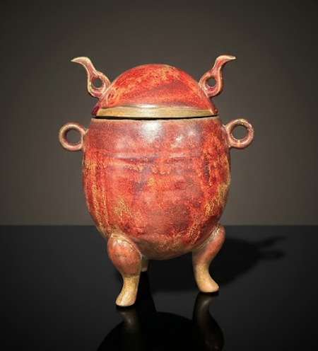 器形取龙蛋之势,通体圆润饱满,比例协调而富张力。腹部鼓起自然,两侧对称饰以细环耳,线条纤巧而不失力度,与厚重器身形成动静对比。顶盖双角微微上扬,使整体轮廓更具层次变化,在端庄之中隐见灵动气息。