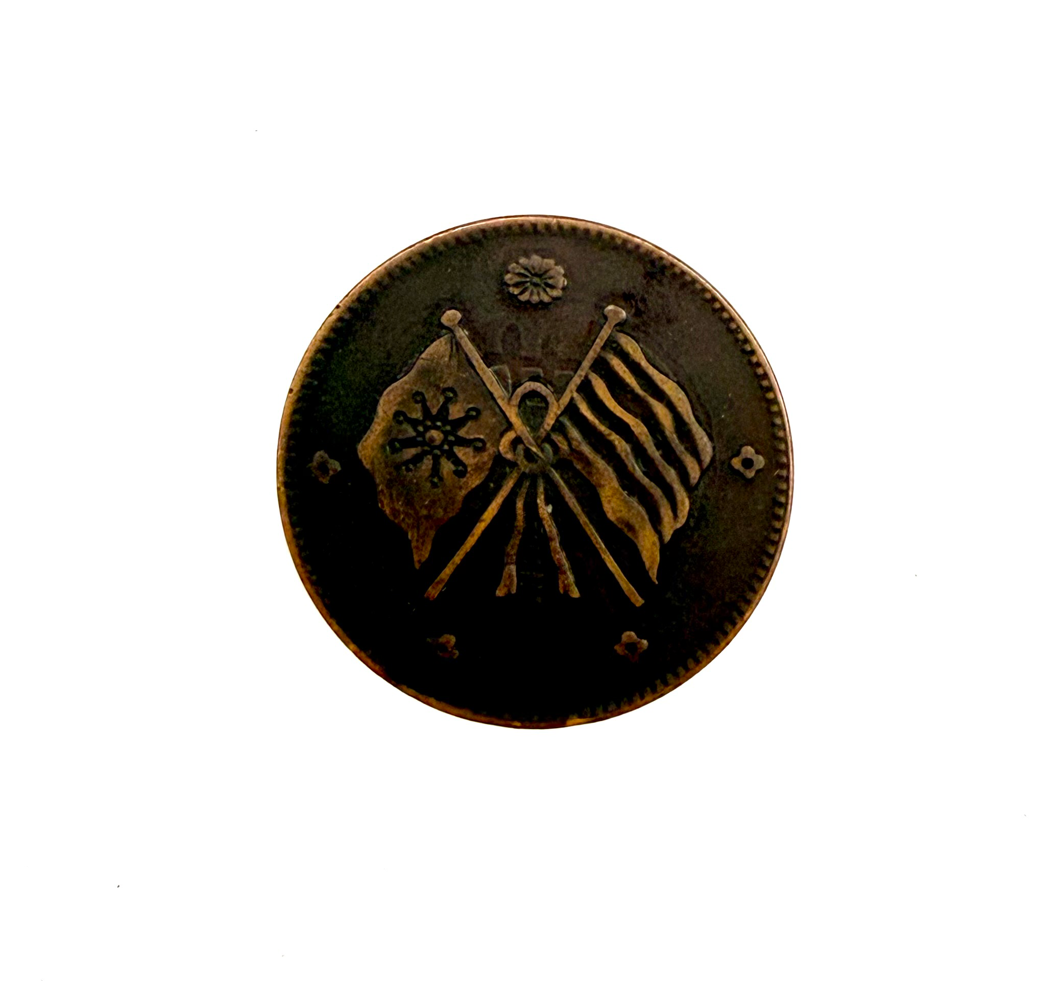 观其正面,中央交叉排列的“铁血十八星旗”与“五色旗”构成核心图案,象征辛亥革命后建立的共和理念与多民族统一格局。双旗之上点缀菊花纹饰,整体构图严谨而富有张力,线条深峻有力,呈现出典型民国铜元的审美特征。此类双旗设计亦是民国初期机制币的重要视觉符号,具有明确的时代指向。