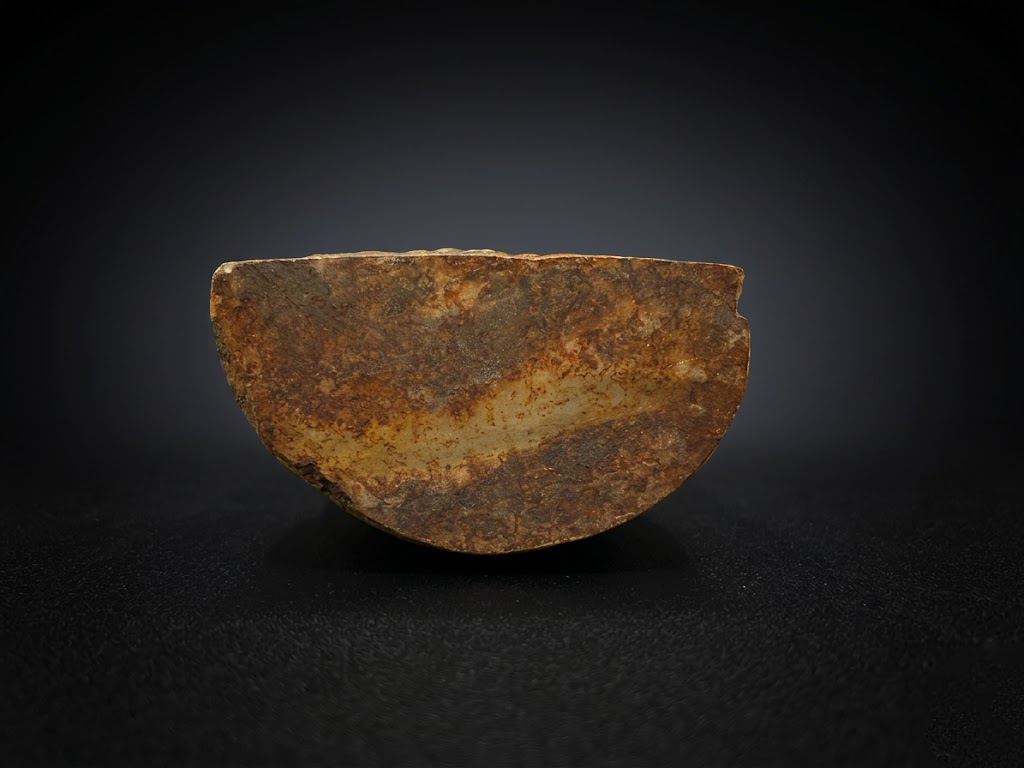 底部可见和田玉特有的细腻质地,温润内敛。表面沁色自然,深浅过渡柔和,呈现出岁月作用下形成的沉稳色调。其底面平整,重心稳定,不仅体现出制作时的严谨,也赋予器物更强的历史厚重感。