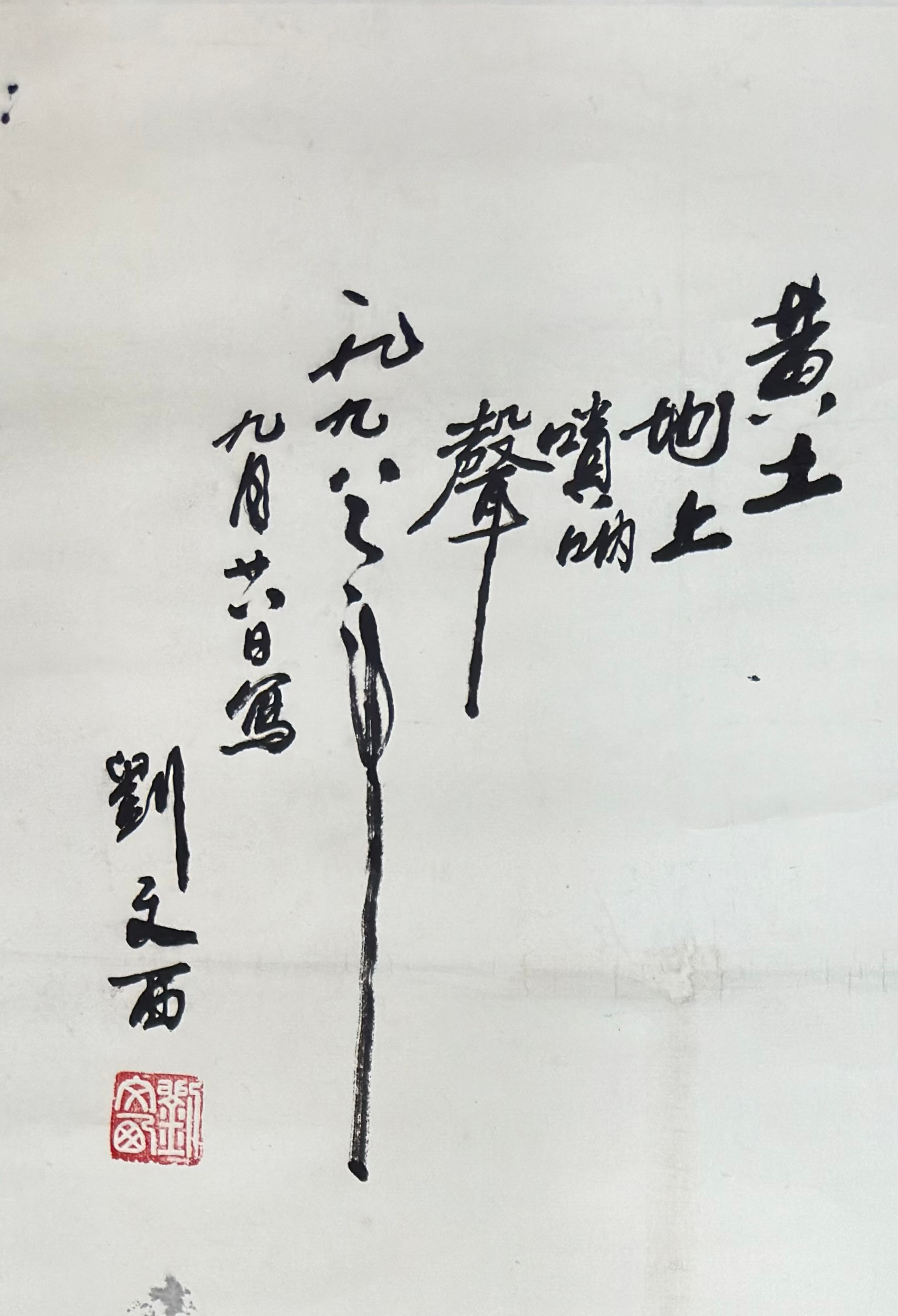 画面左上方题写“黄土地上唢呐声”,行草书写与绘画气息相互贯通。书法线条与人物衣纹、面部刻画形成内在呼应,使整幅作品在形式上达到统一。印章的点缀不仅平衡了构图,也强化了作品的文人气息与历史标识,使其在视觉与文化层面均具完整性。