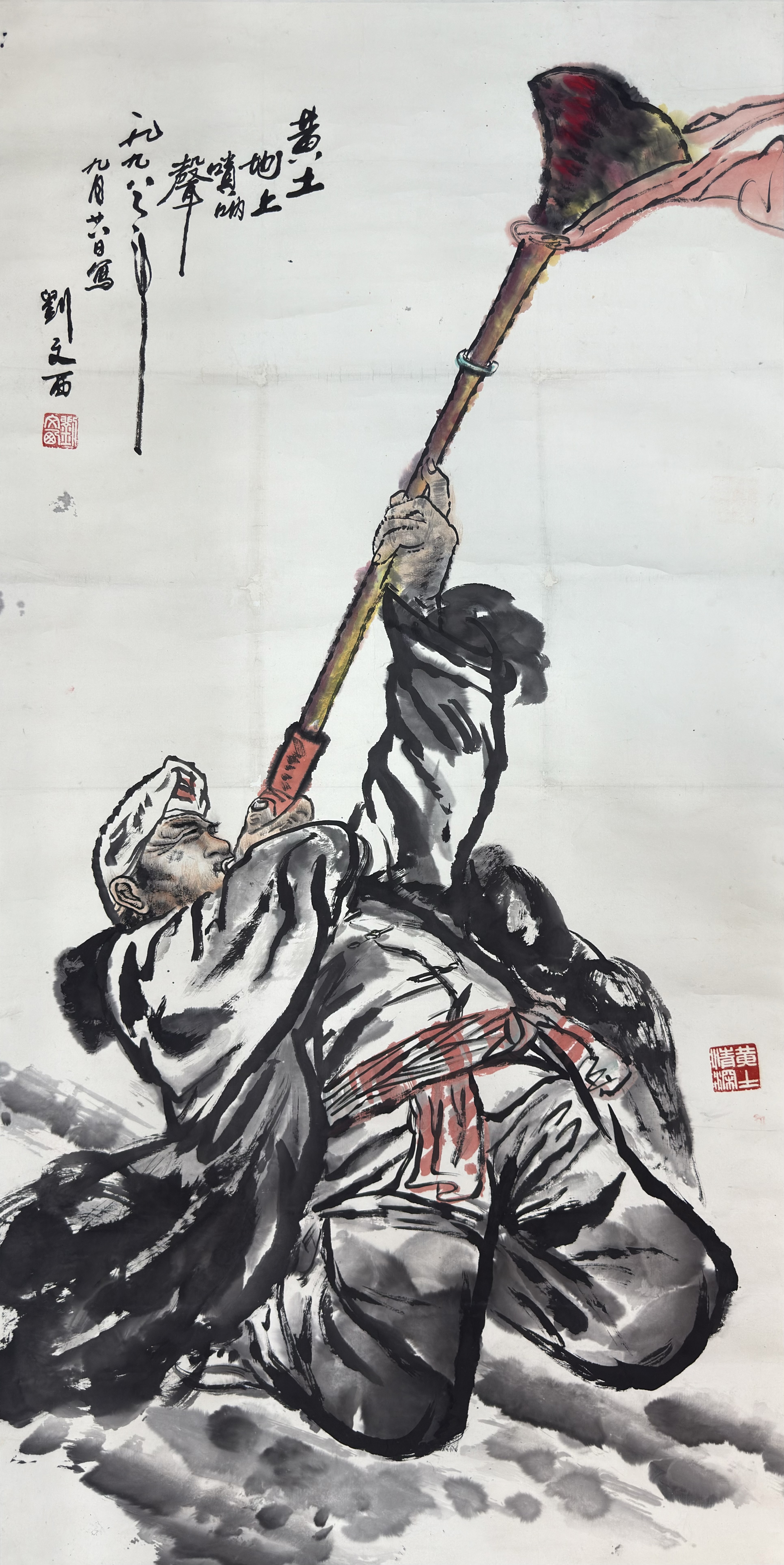 这幅《黄土地上唢呐声》出自刘文西先生之手,创作于1988年。作品尺幅136 × 68 cm,以极具张力的视觉语言,将陕北高原的精神气质凝练于一瞬之间。在中国人物画由传统向现实主义转型的进程中,这件作品既承续笔墨传统,又融入鲜明的时代观照,成为黄土题材创作中的代表性图像。
