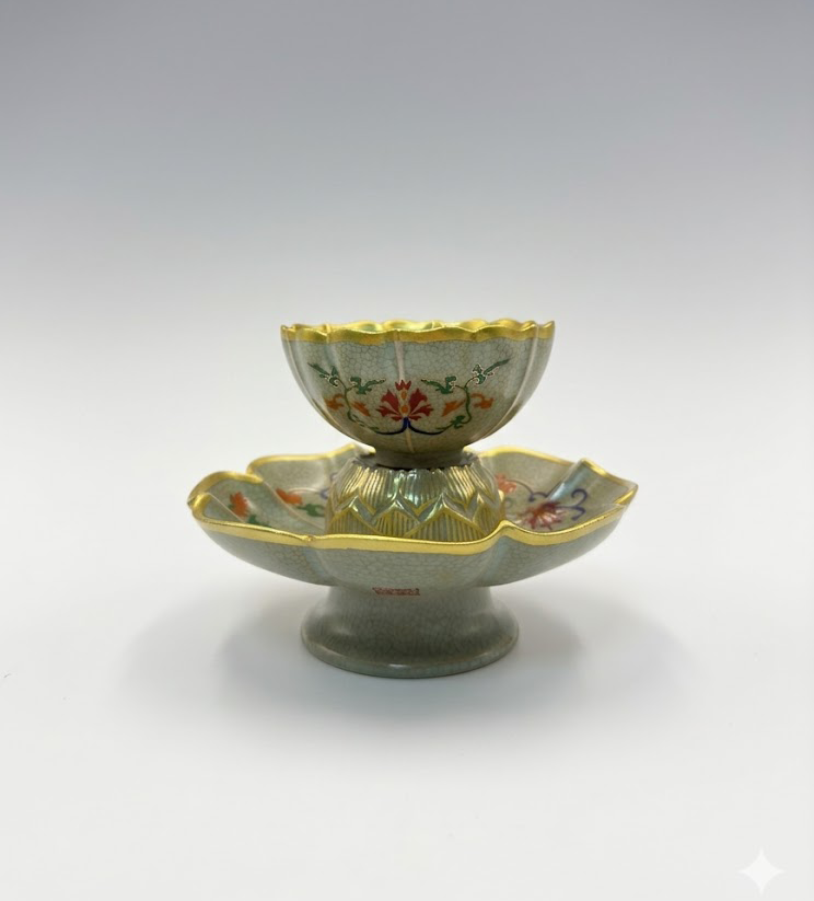 整套器物由茶杯与高足托盘组合而成,高低错落之间形成稳定而优雅的比例关系。茶杯呈花瓣式开口,如莲初绽,置于托盘之上,宛若层层托举,意象清雅。由下而上,线条收放有度,重心稳健,使观赏与使用在同一结构中得以平衡。整体既具陈设之美,亦不失实用之本。