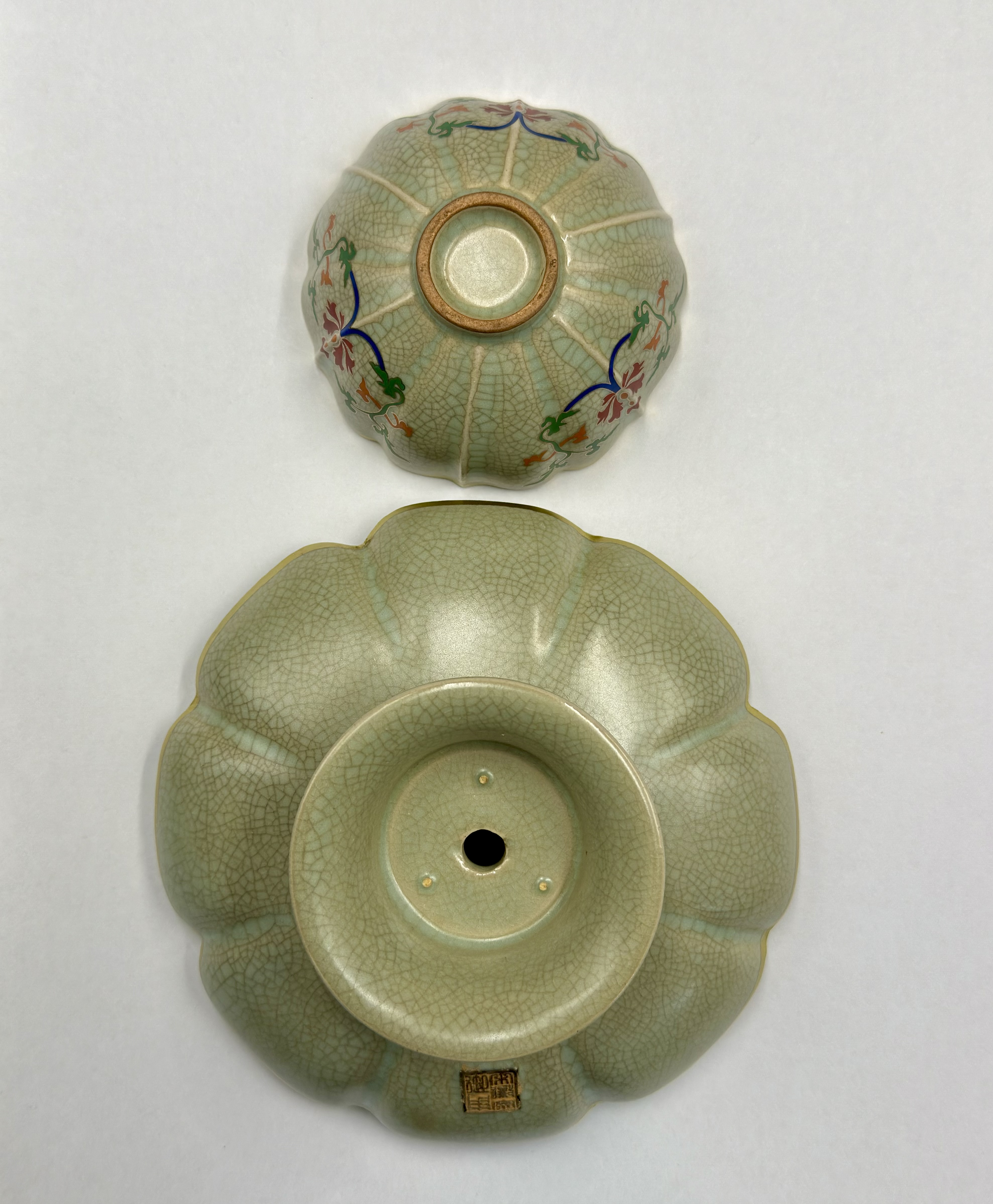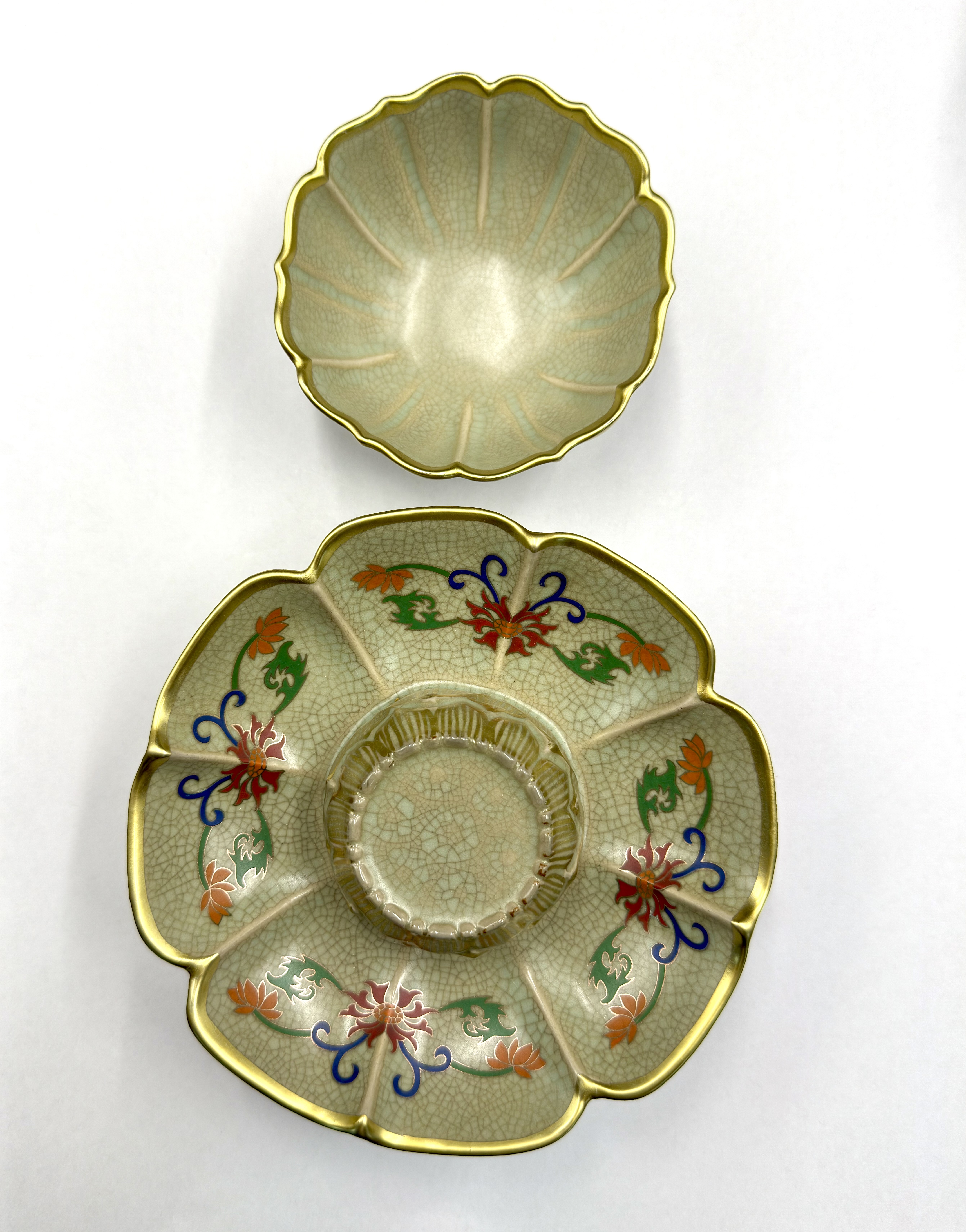 茶托内壁以珐琅彩绘缠枝花卉,构图繁而不乱,色彩明丽而不浮艳。花叶舒展有致,与青润釉面相互映衬,形成冷暖对比的视觉张力。口沿施以描金,线条厚重而富节奏感,在增强器物轮廓的同时,也赋予其更为庄雅的气度。花口造型因金彩点缀而愈显层次分明,转折处灵动自然。