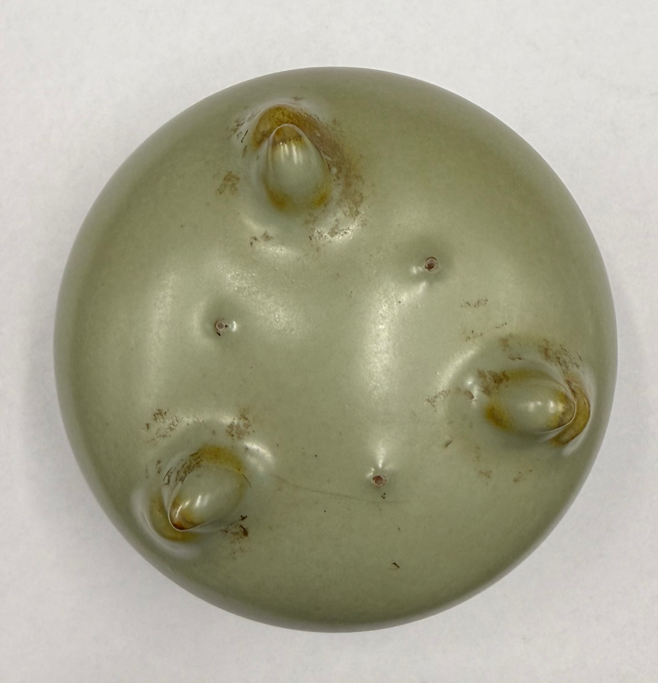 底部三枚细小支钉痕清晰可辨,此为汝窑典型的“裹足支烧”工艺特征。支点细若芝麻,排列规整,既保证了器物烧造过程中的稳定,又不破坏整体美感。露胎处呈香灰色,胎质细密坚实,为判断宋代汝瓷的重要依据之一,也体现了当时制瓷工艺的成熟与严谨。