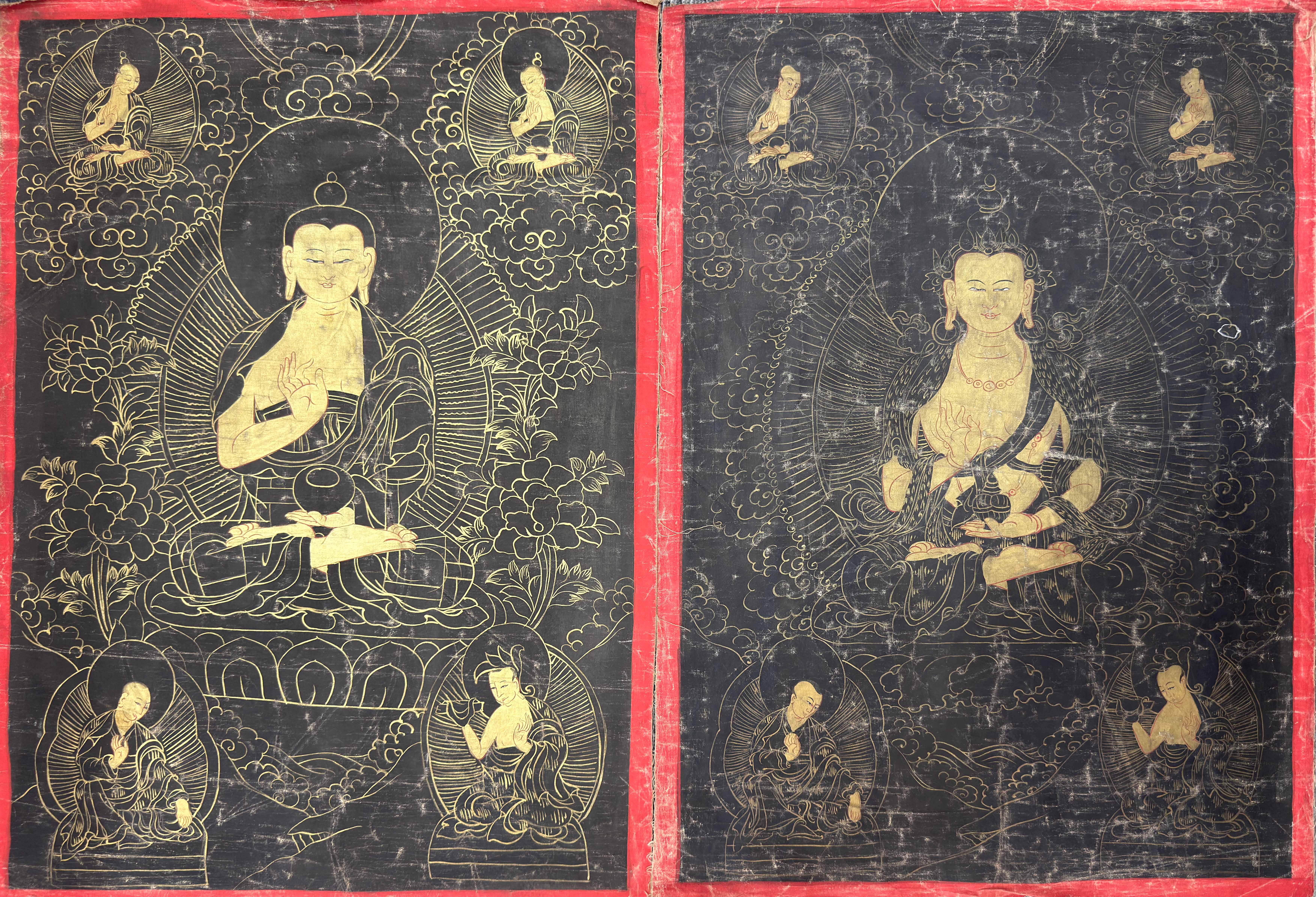 作为清代藏传佛教艺术的重要类型,黑唐金彩佛像不仅是供奉之物,更承载着完整的宗教象征体系与修行观念。其严格遵循造像比例与仪轨,同时又在细节处理上展现出极高的艺术审美,使宗教信仰与绘画技艺达成统一。这组双幅作品,无论从构图体系、人物刻画,还是工艺表现来看,均体现出成熟而严整的时代风貌,具有鲜明的历史与艺术价值。