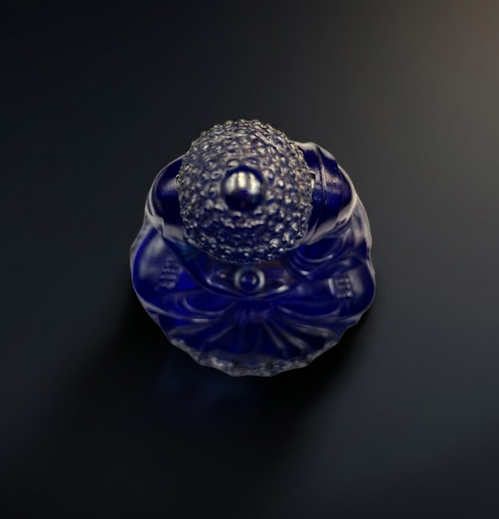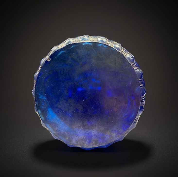 从顶部俯视,螺发排列紧密有序,层层递进,极具规整之美。琉璃材质在光线映照下呈现出深蓝至幽紫的渐变效果,色层丰富且过渡自然,体现出高温熔融与冷却过程中对火候的精准掌控。其质地温润而通透,内含若隐若现的流动纹理,为清代料器特有的工艺印记,也使整件作品更具生命感与层次感。
