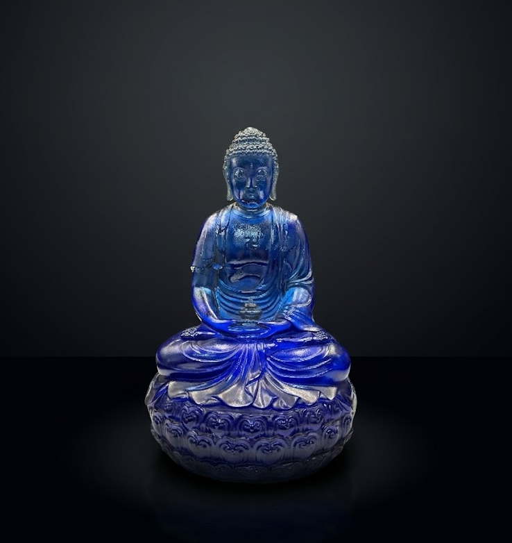 在中国传统造像艺术体系中,佛教造像不仅承载信仰,更是工艺与审美的集中体现。此尊清代琉璃佛像,以沉稳深邃的色泽与通透内敛的质感,呈现出典型的宫廷料器艺术风范。其通体泛出如蓝宝石般的幽靓光泽,在光影流转之间,散发出宁静而庄严的宗教气息。藏品规格:高20.5cm,底宽12.3cm,底高3cm